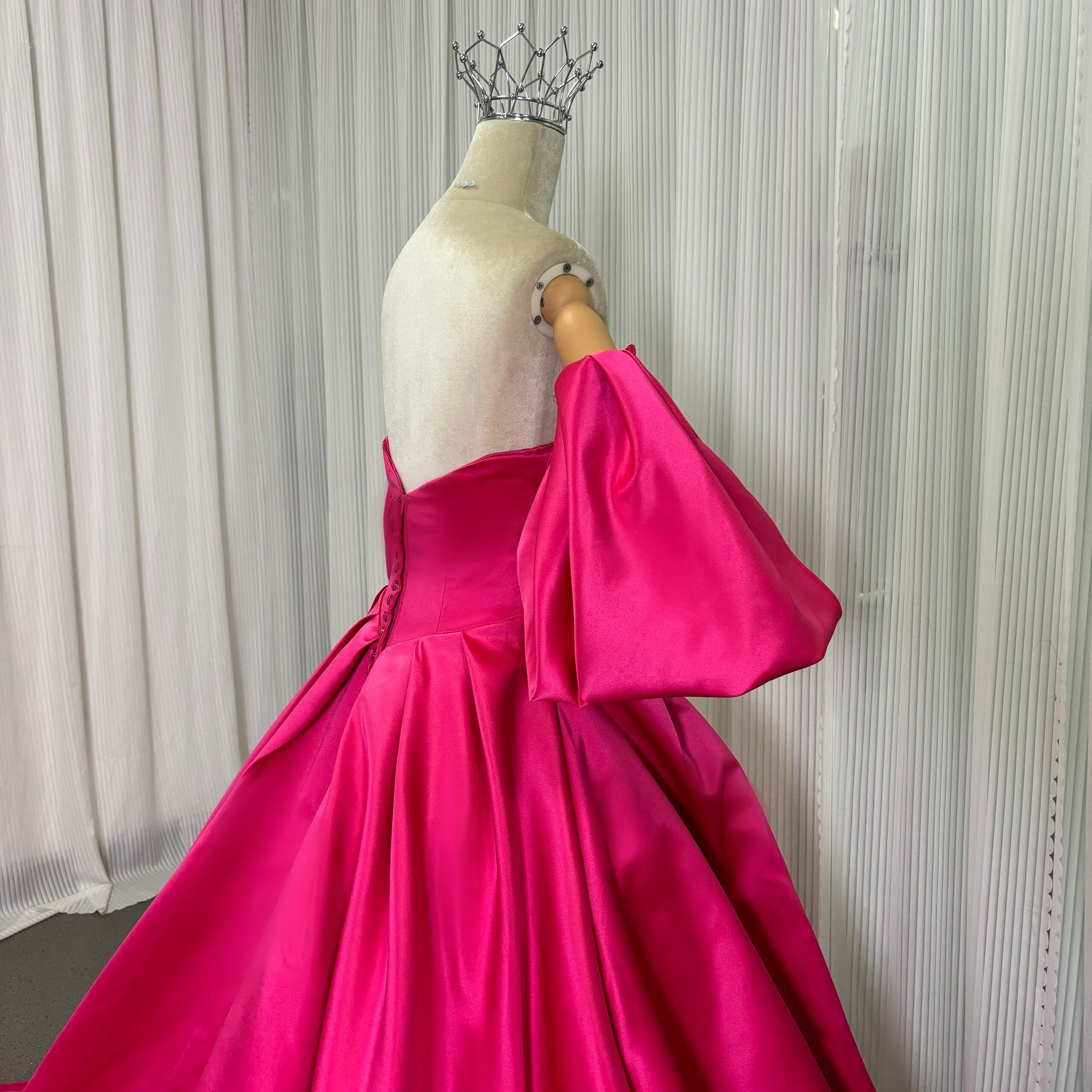 カラードレス ビビッドピンク 光沢サテン 取り外し可能な付け袖 くるみボタン ファスナー トレーン 花嫁 前撮り