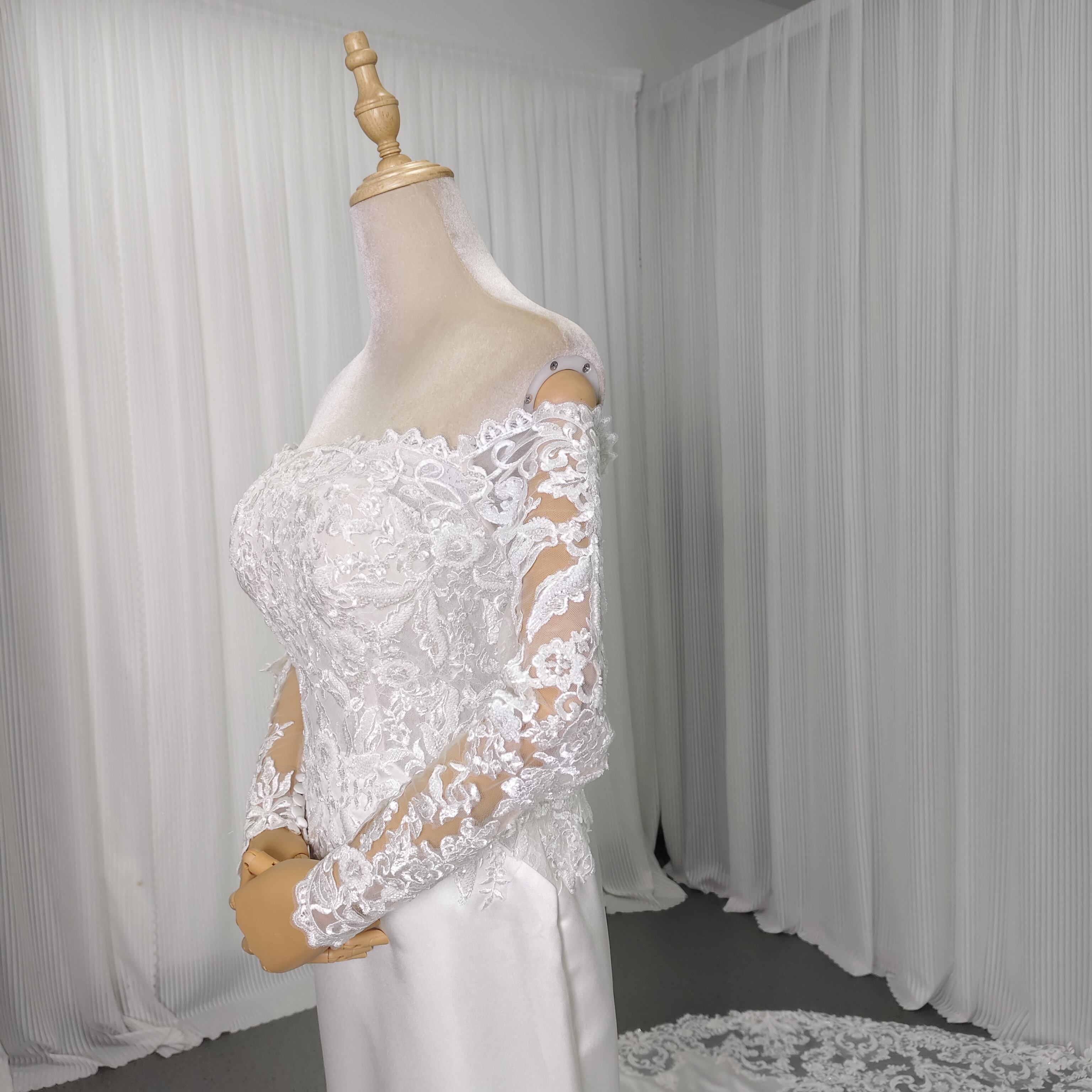ウエディングドレス オフホワイト 肩出し ロングスリーブ 細見えシルエット 繊細なレース 華やかなトレーン 結婚式