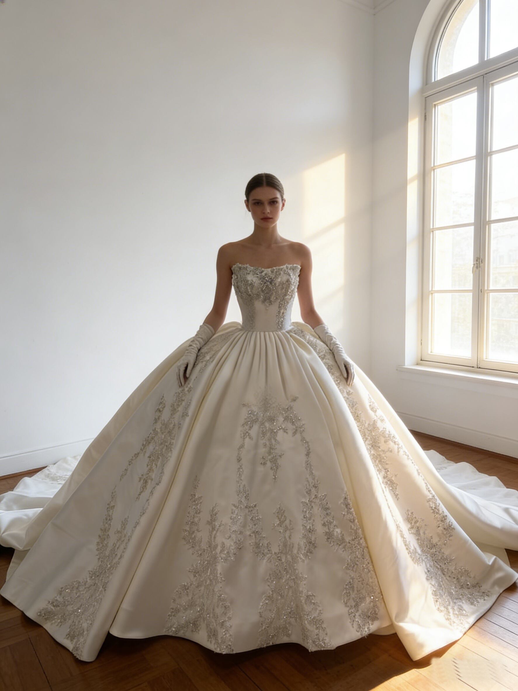 ウエディングドレス オフホワイト 韓国風ドレス 華やかなトレーン ミカドサテン キラキラのハンドビーディング ビスチェドレス ブライダル