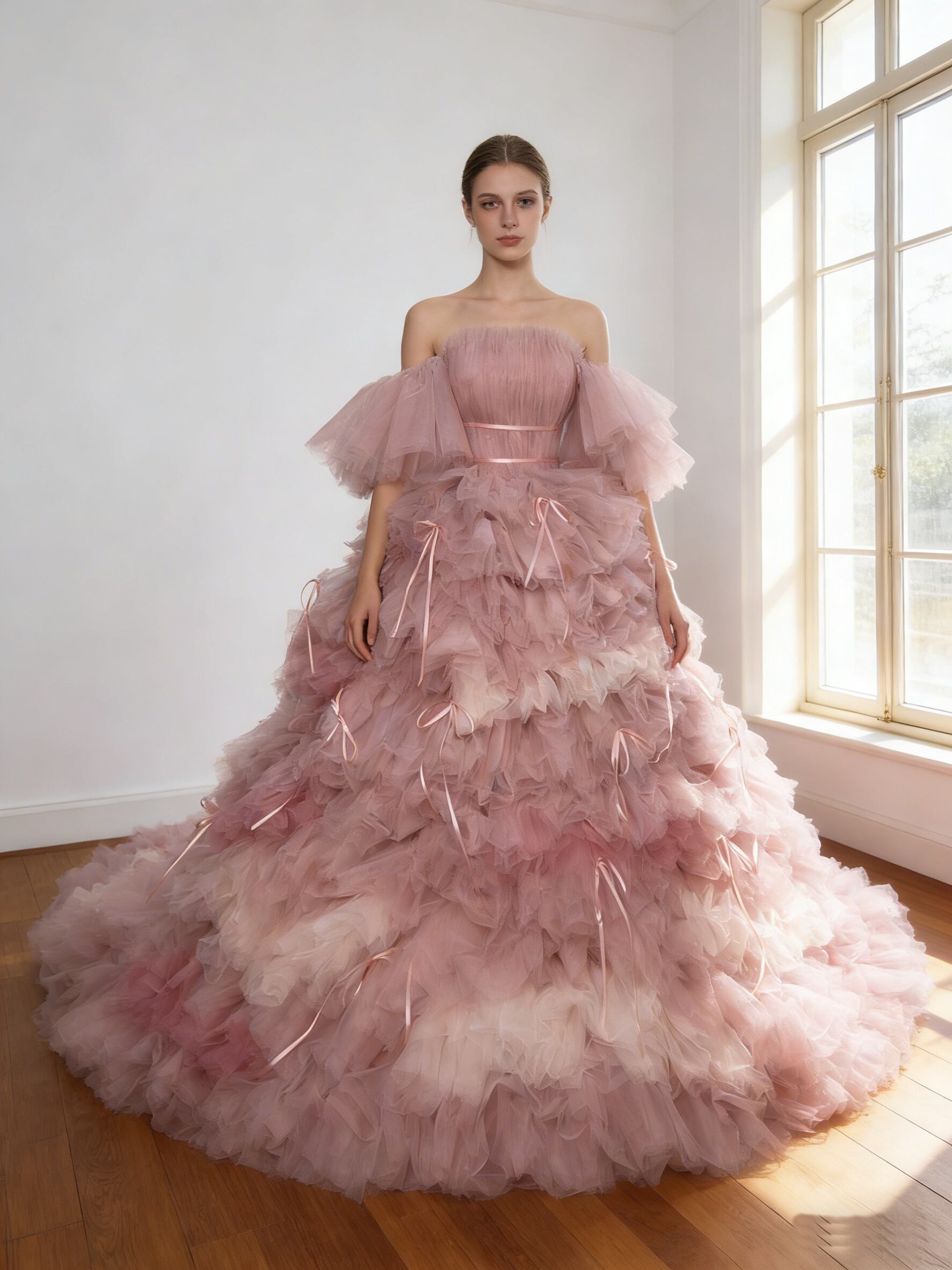 カラードレス ピンク 柔らかく重ねたチュールスカート 華やかなトレーン プリンセスライン リボン 可愛い 花嫁 前撮り
