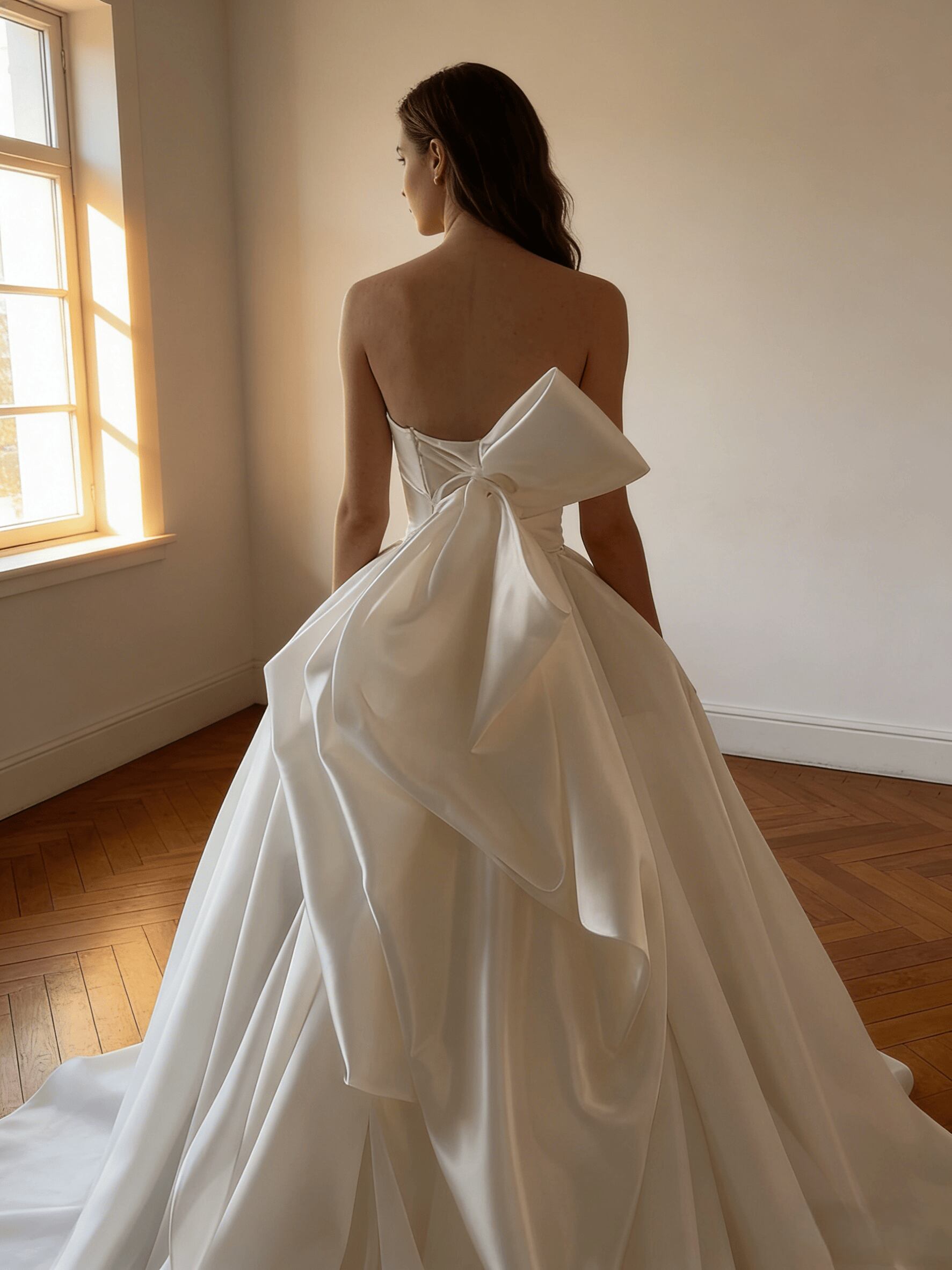 ウエディングドレス オフホワイト シルクオーガンジーサテン ふっくら柔らかなバックリボン 華やかなトレーン ビスチェドレス ブライダル