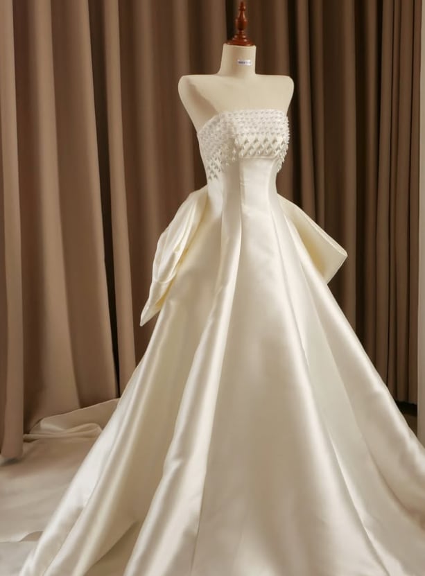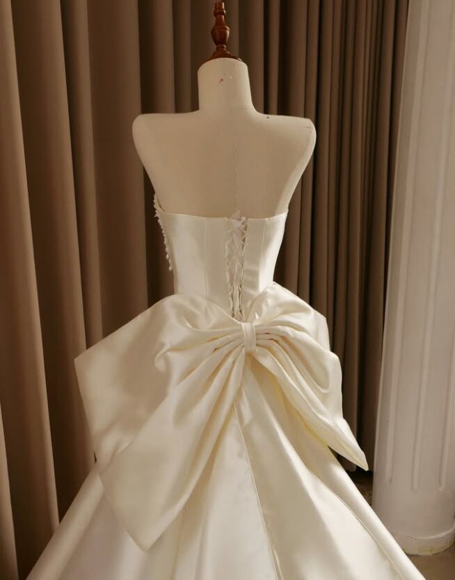 ウエディングドレス オフホワイト 光沢サテン パール ふっくら柔らかなバックリボン ビスチェドレス 編み上げ 結婚式