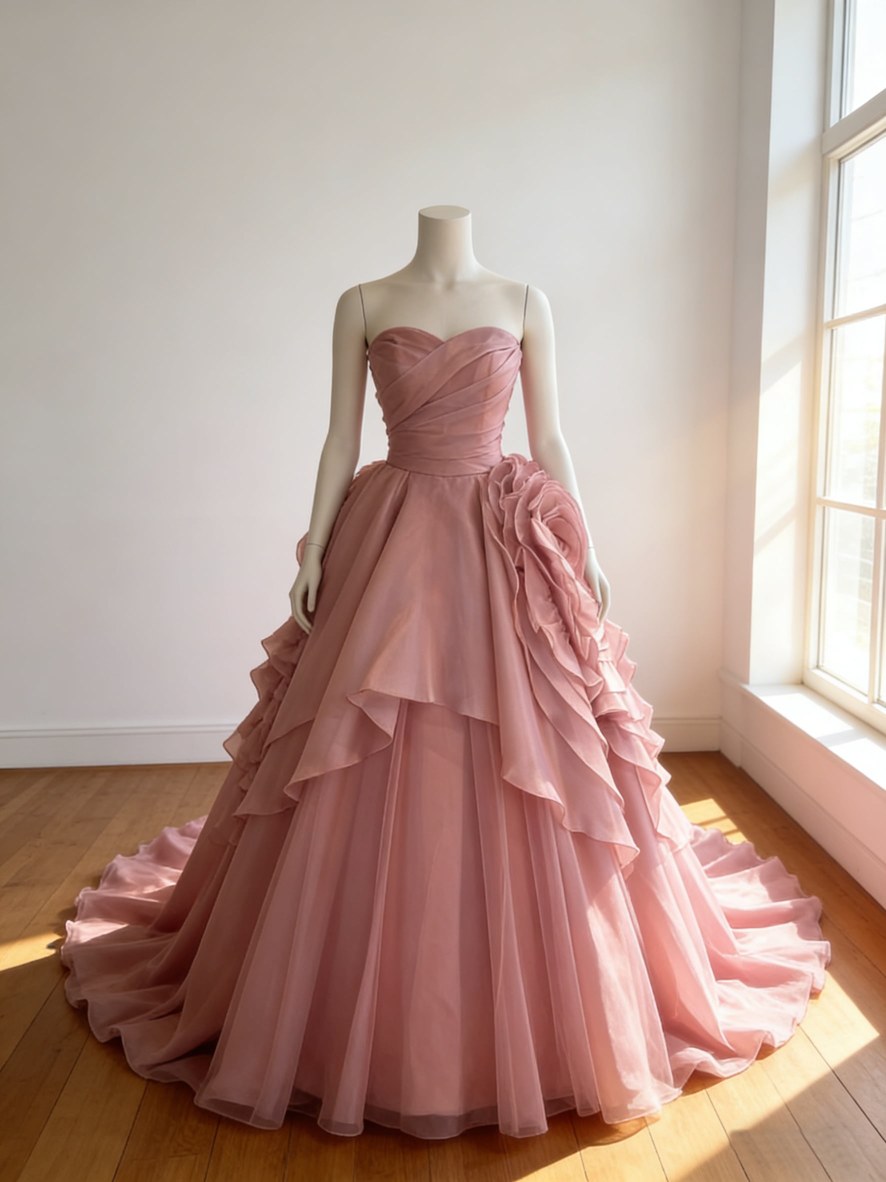 カラードレス ピンク ビスチェドレス バラトレーン 華やかなトレーン ウェーブ 結婚式