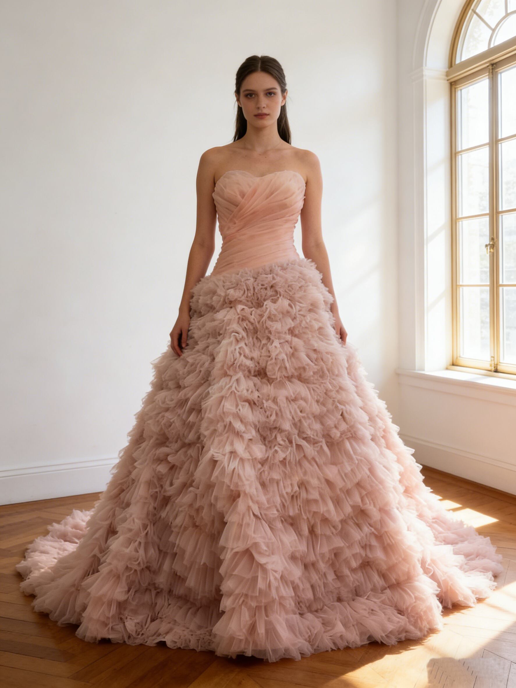 カラードレス ピンク もこもこドレス ビスチェドレス 韓国風ドレス 柔らかく重ねたチュールスカート 花嫁