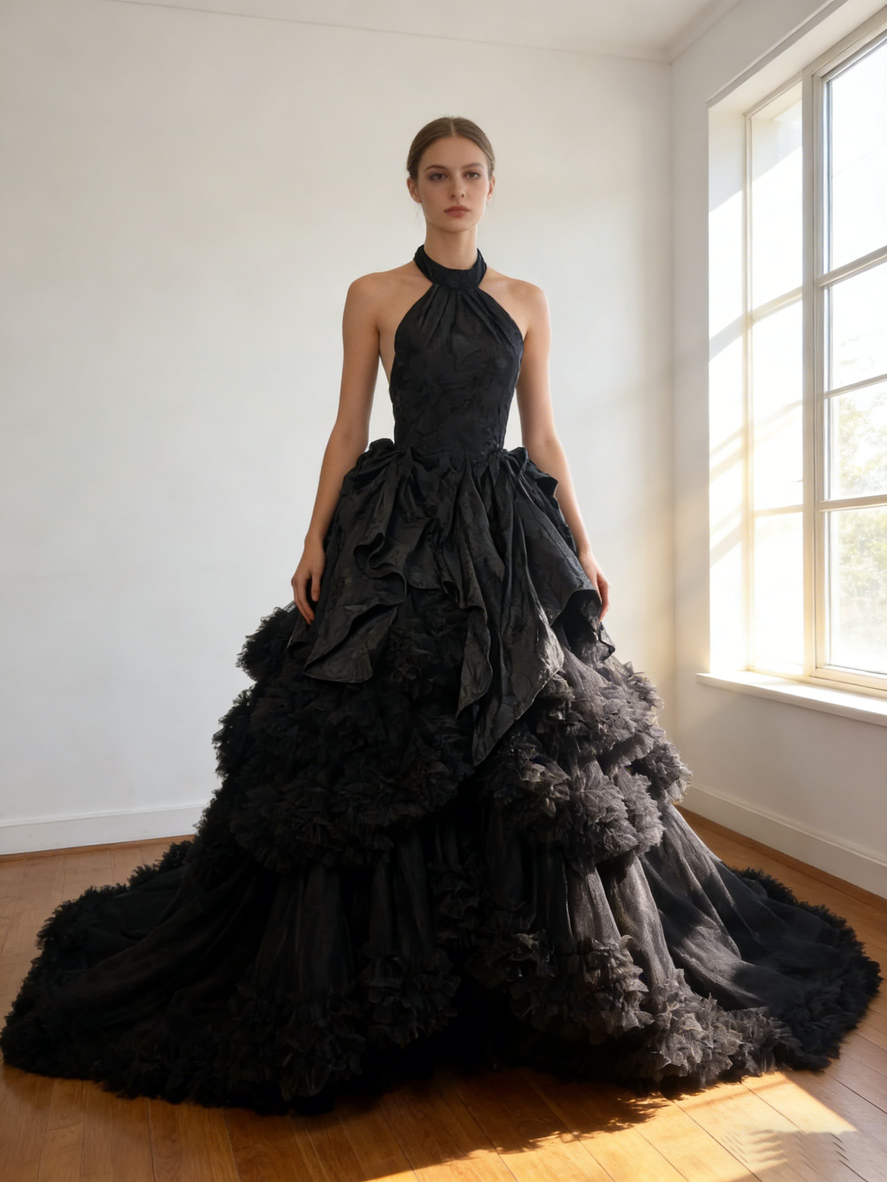 カラードレス ブラック アメスリ ジャガード生地 ボリュームドレス アシンメトリー風 結婚式