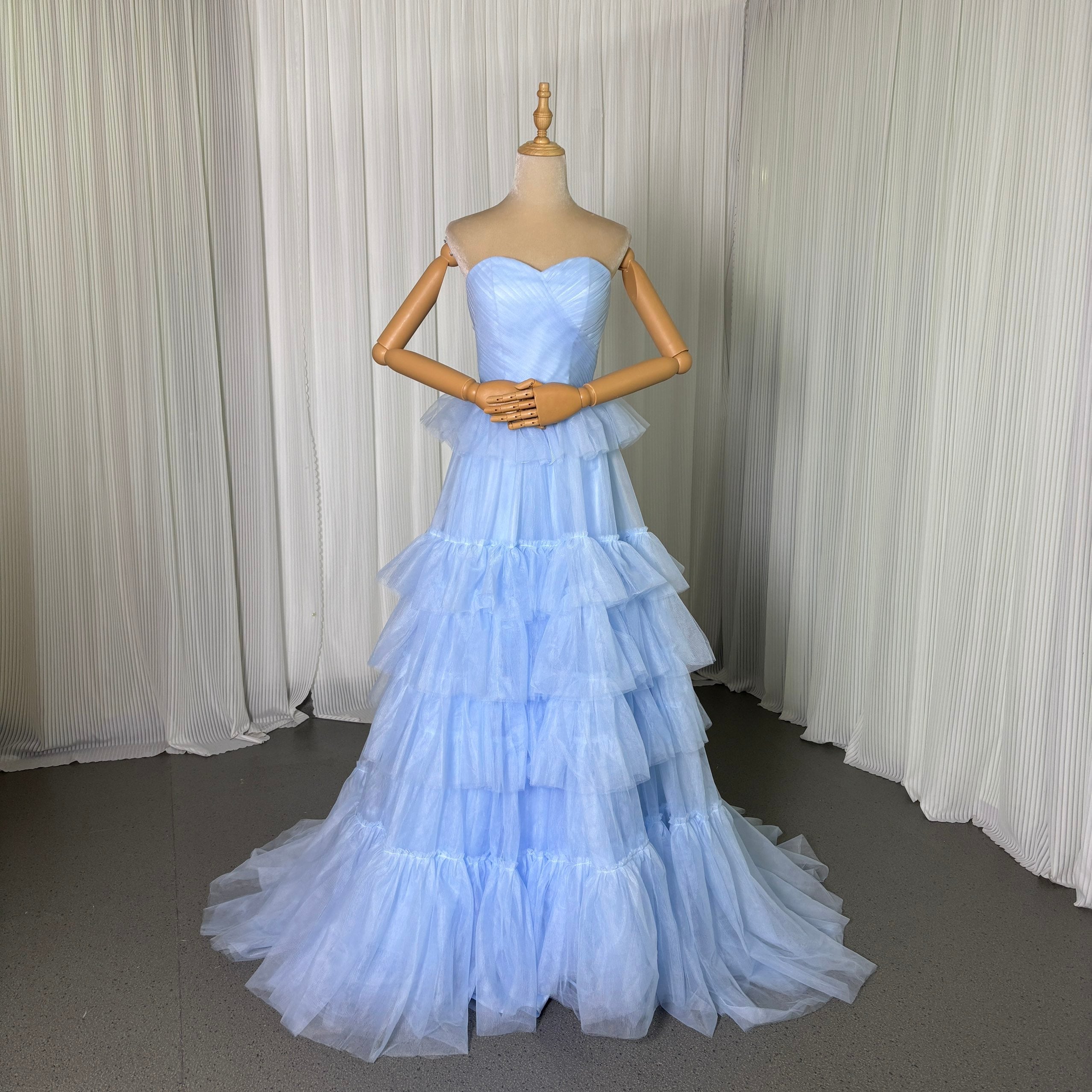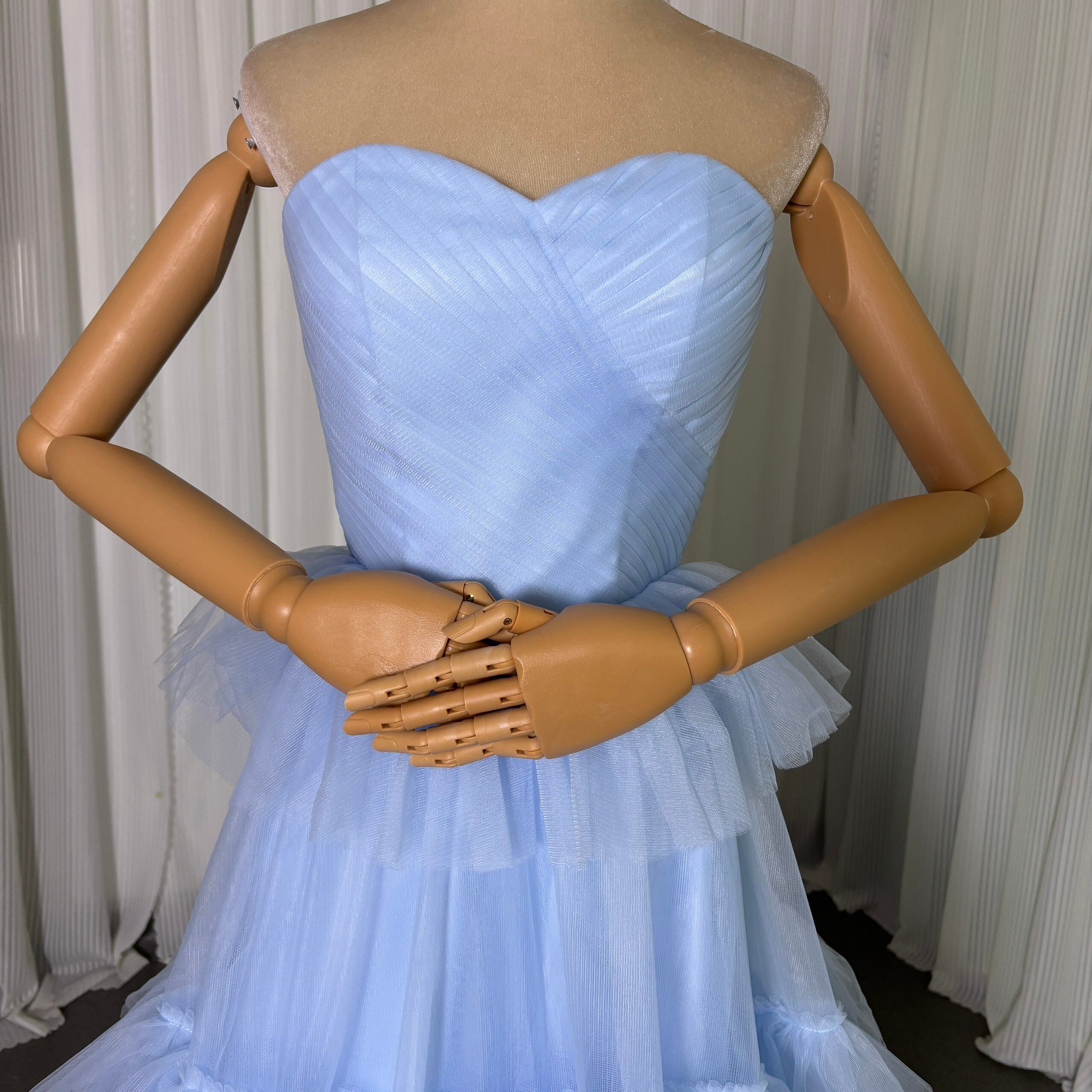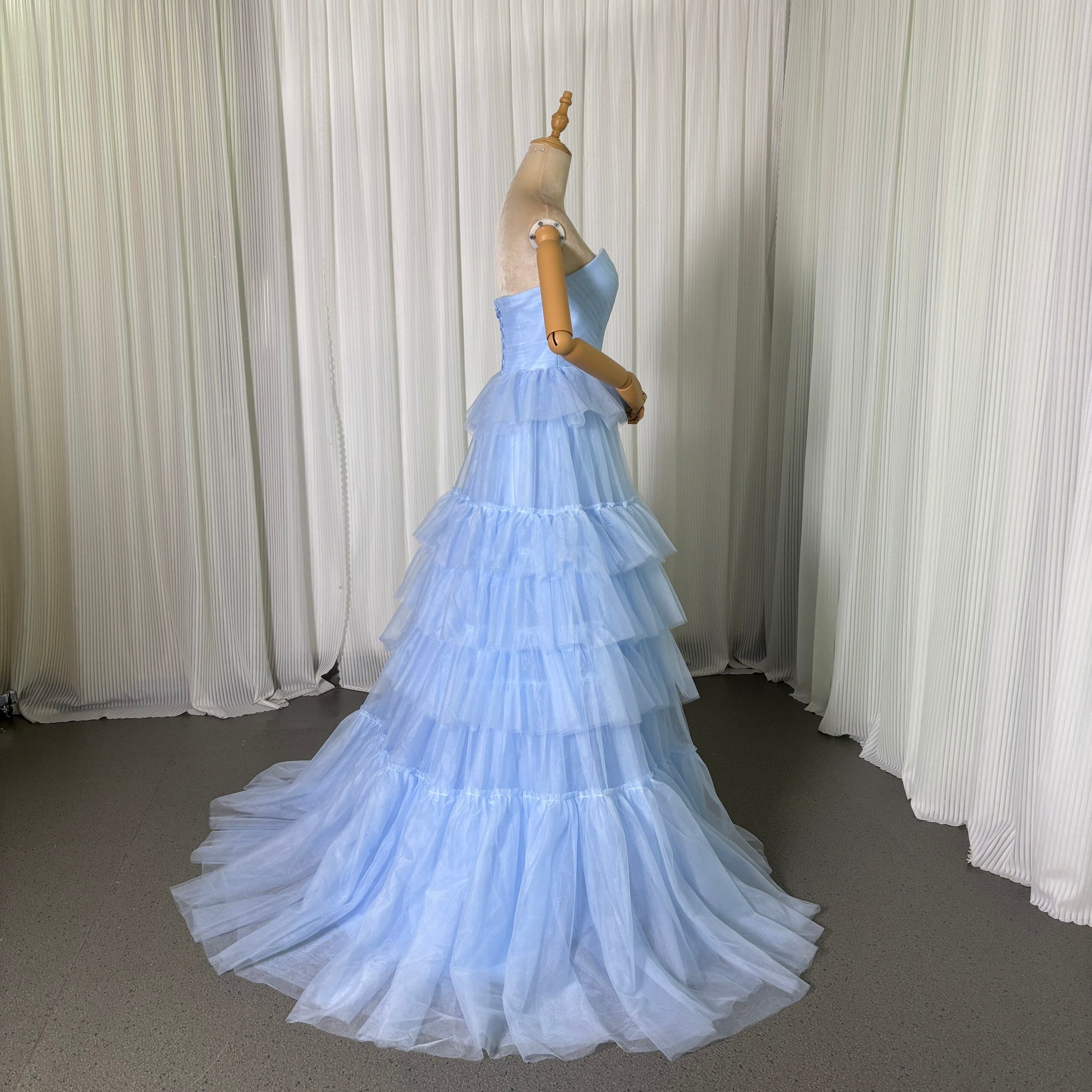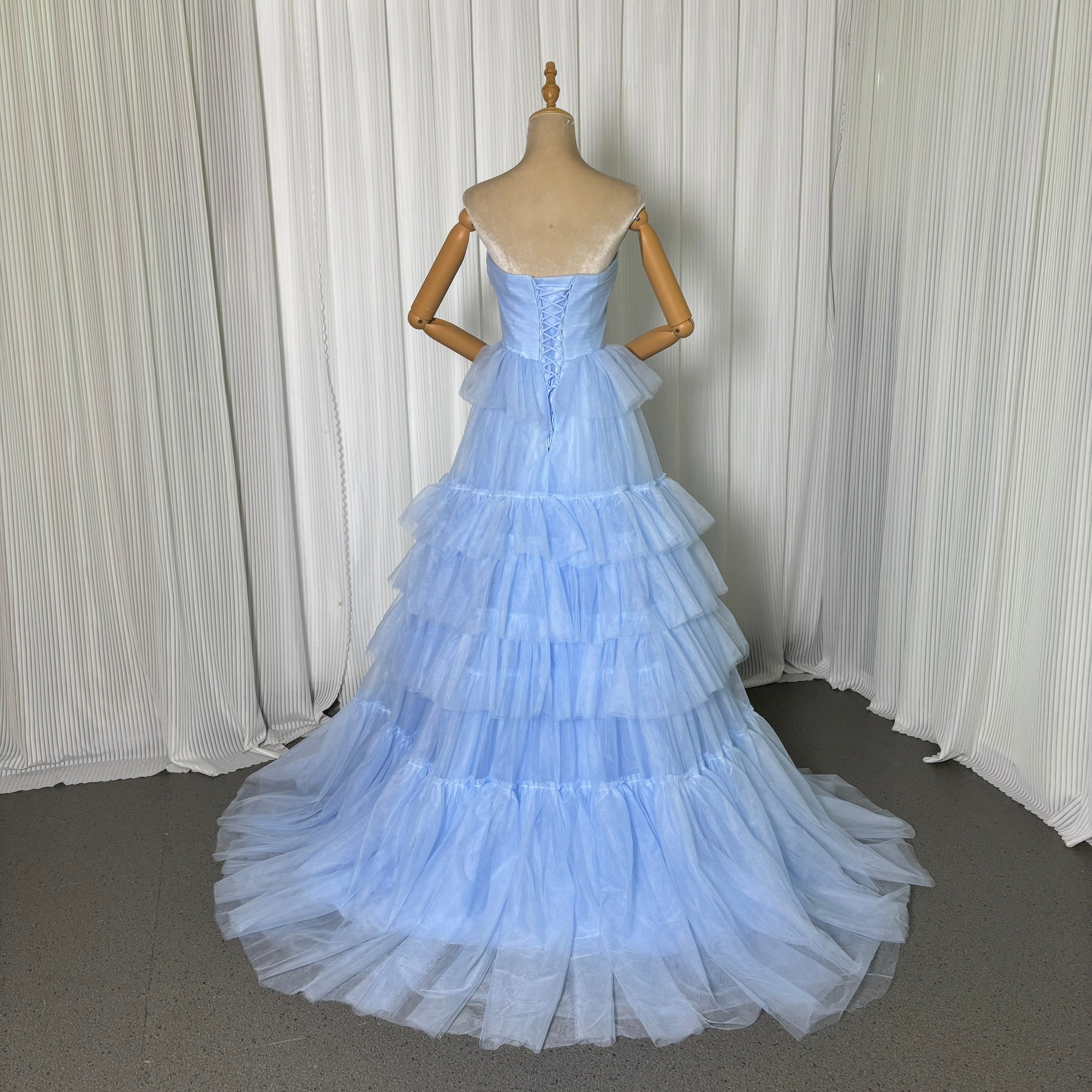 カラードレス 爽やかで優しいブルー ティアードのドレス スリット ビスチェドレス トレーン 花嫁 前撮り