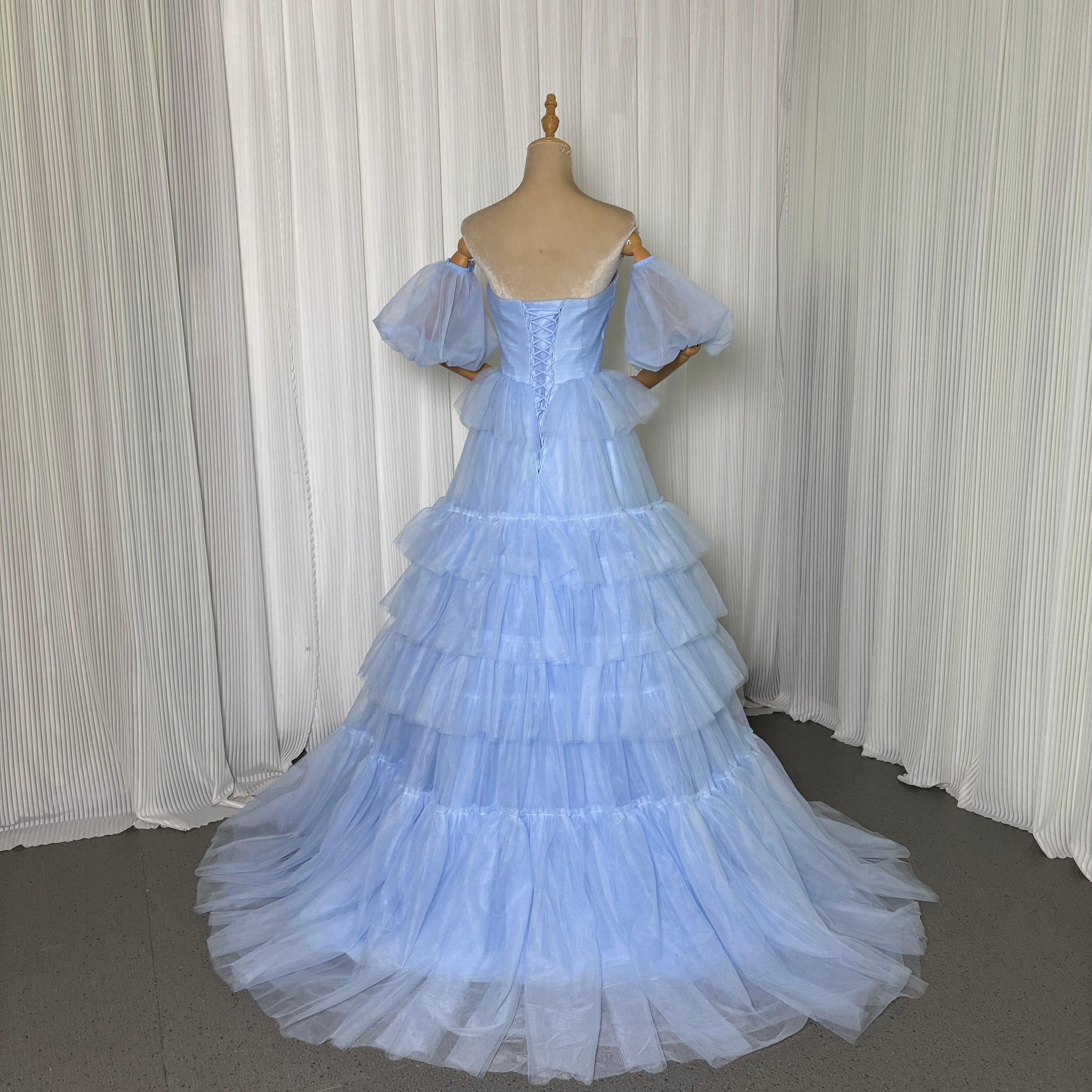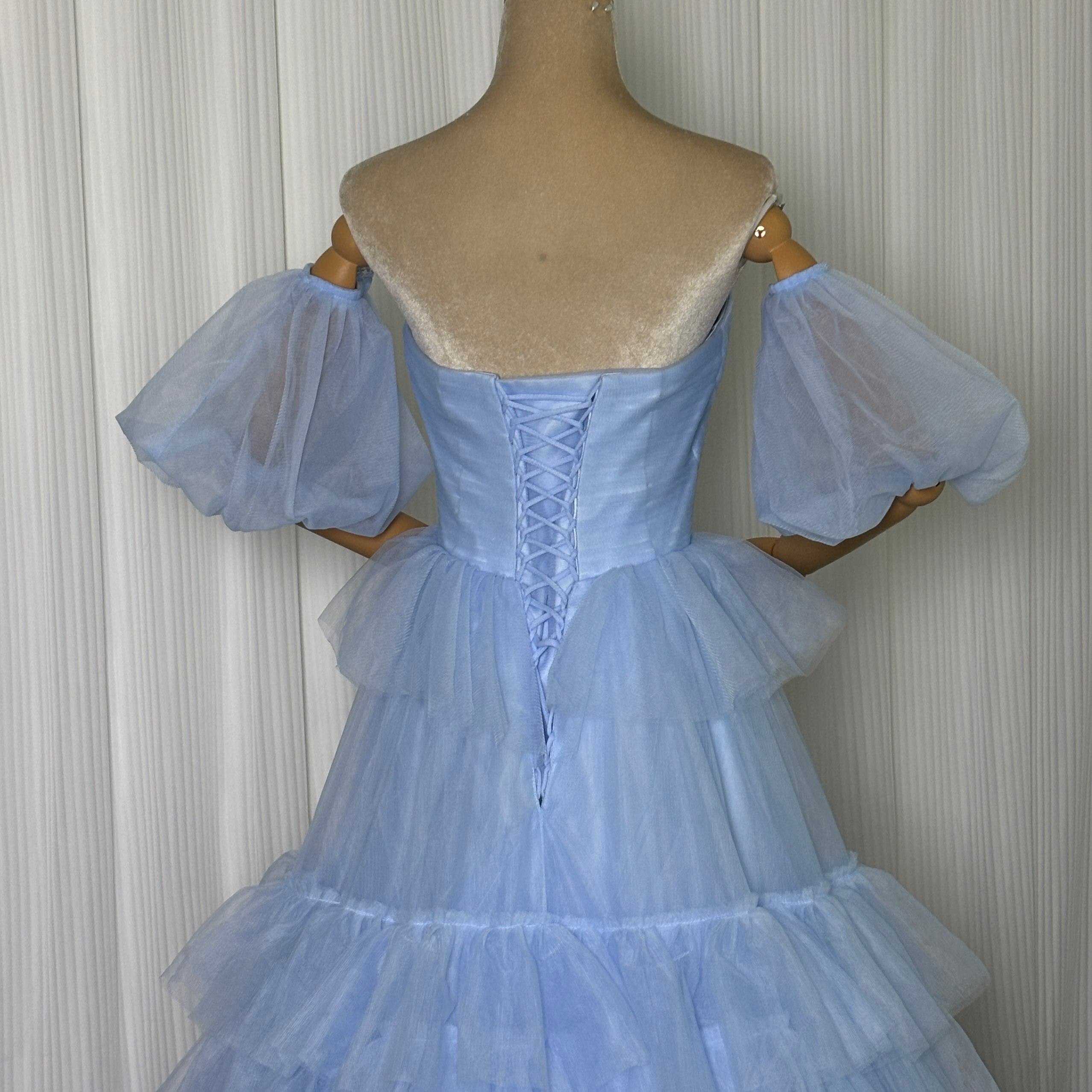 カラードレス 爽やかで優しいブルー ティアードのドレス スリット 取り外し可能な付け袖 トレーン 花嫁 前撮り