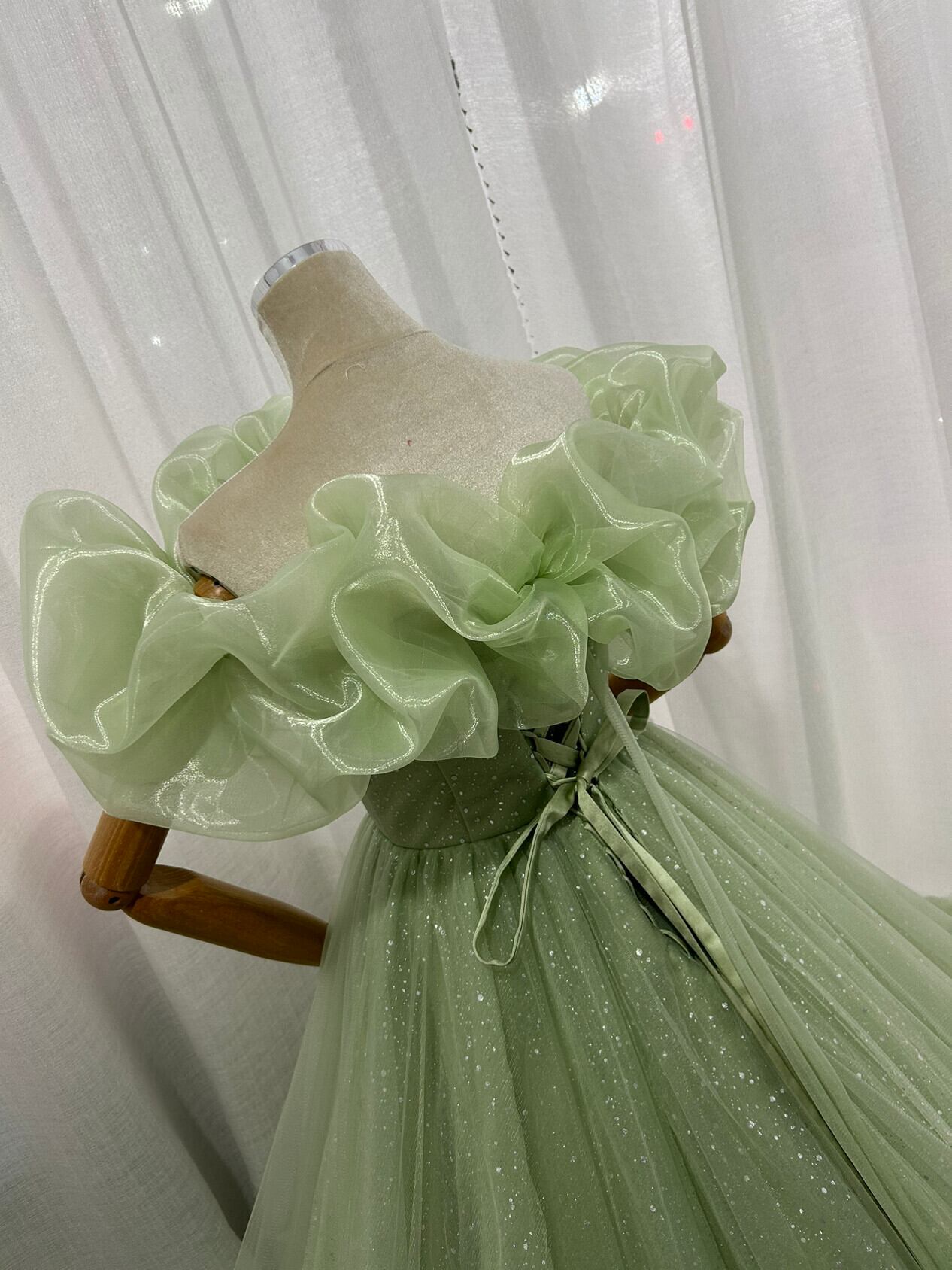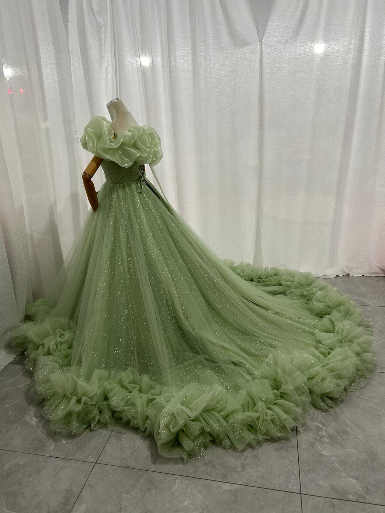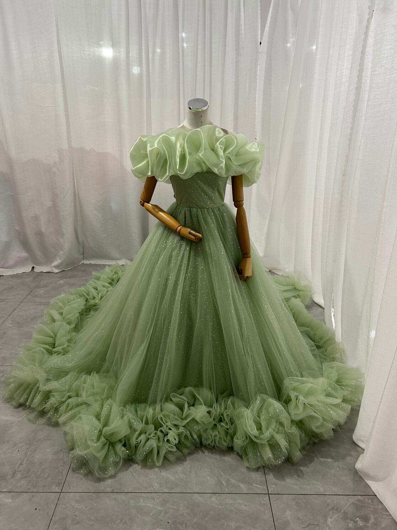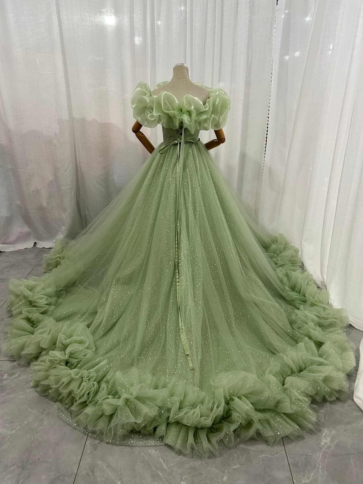 カラードレス グリーン 取り外し可能なオフショルダー シークインチュール ボリュームドレス 華やかなトレーン 結婚式