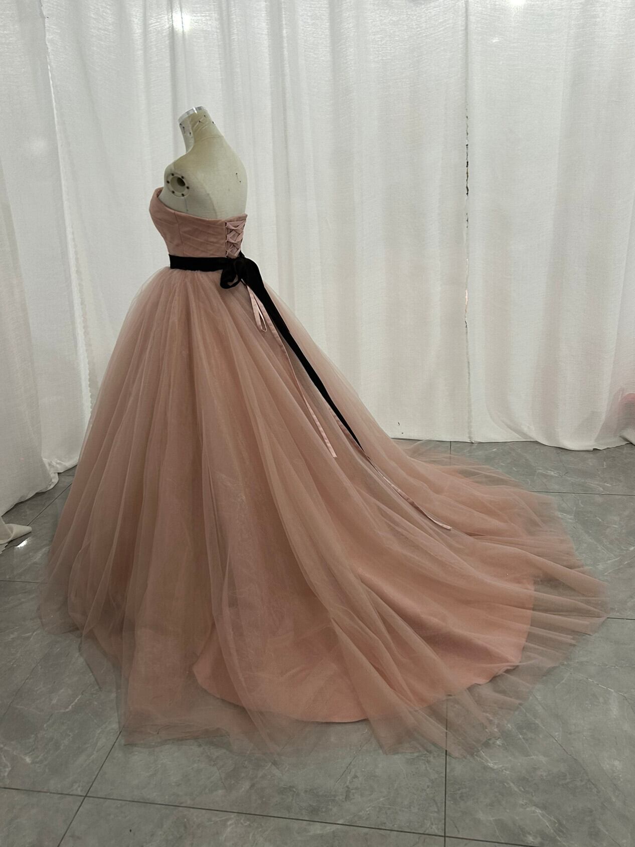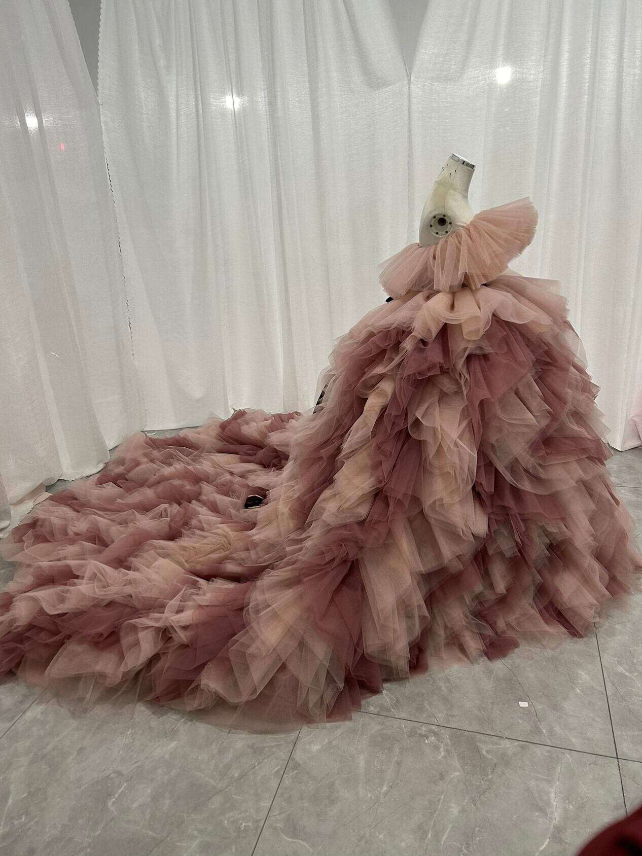 カラードレス 2WAYの着方 くすみピンク 取り外し可能なオフショルダー ツーピース ボリュームドレス 華やかなトレーン 花嫁