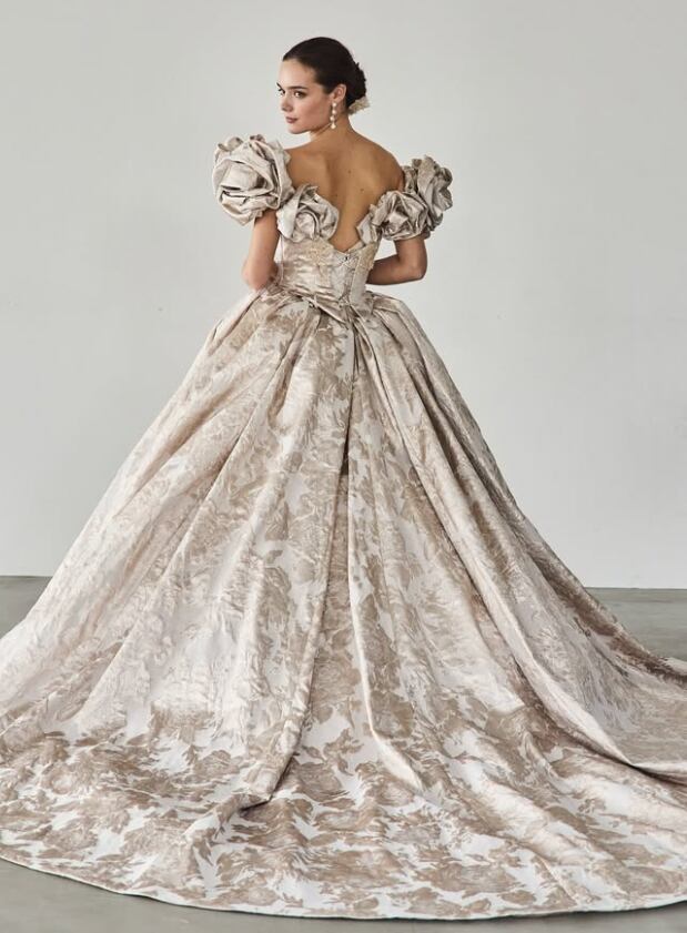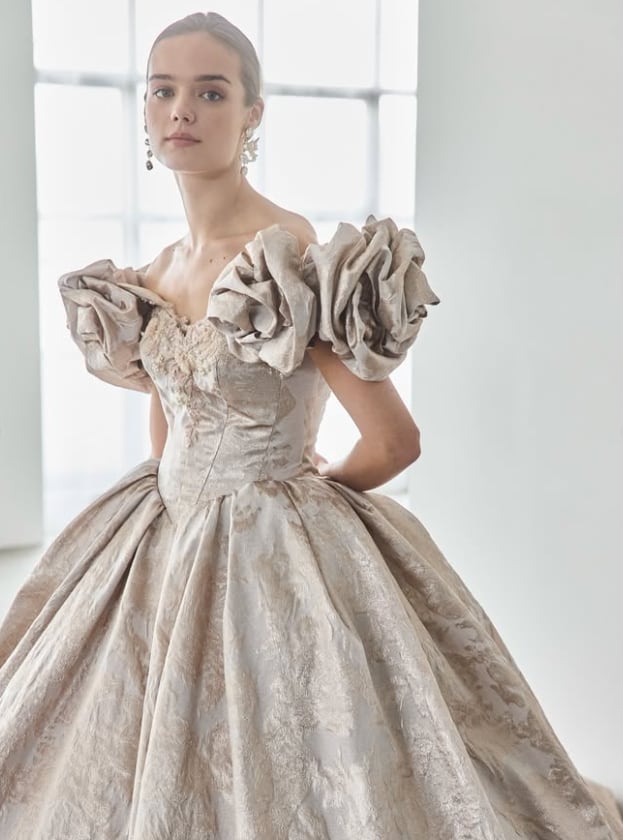 カラードレス あんず色 パフスリーブ ジャガード生地 編み上げ 華やかなトレーン 結婚式 前撮り