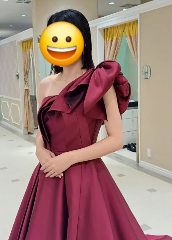 カラードレス ワインレッド ショルダー型 光沢感 華やかなトレーン 花嫁