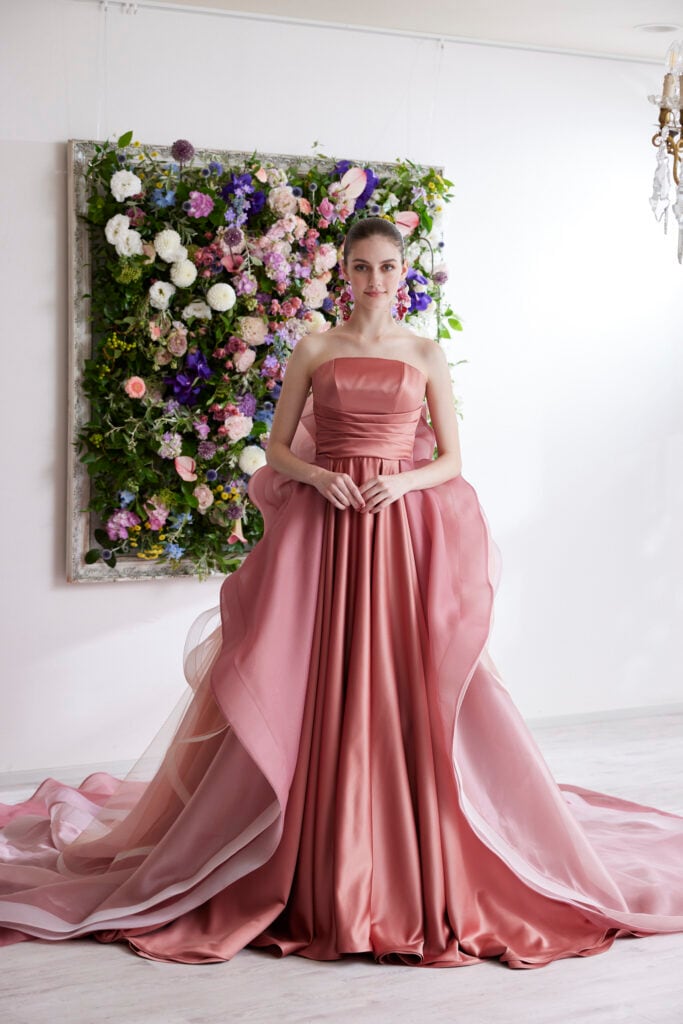 カラードレス ピンク 立体ドレープ 光沢サテン 上質オーガンジー 華やかなトレーン ビスチェドレス 結婚式