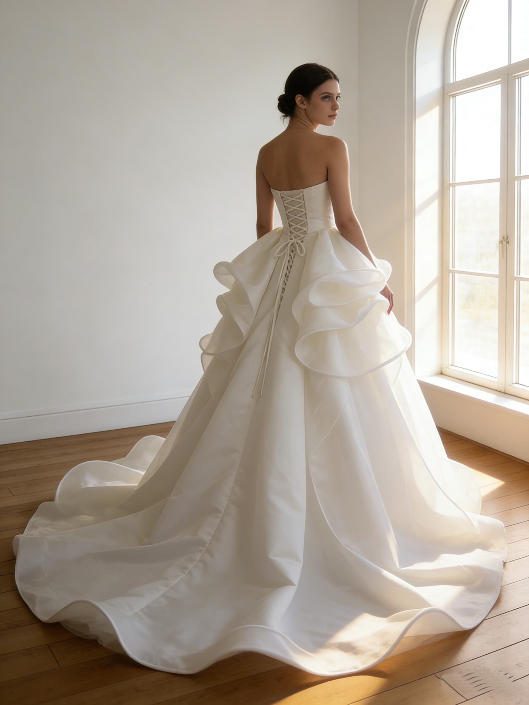 ウエディングドレス オフホワイト 光沢サテン+上質オーガンジー ビスチェドレス ウェーブ ブライダル