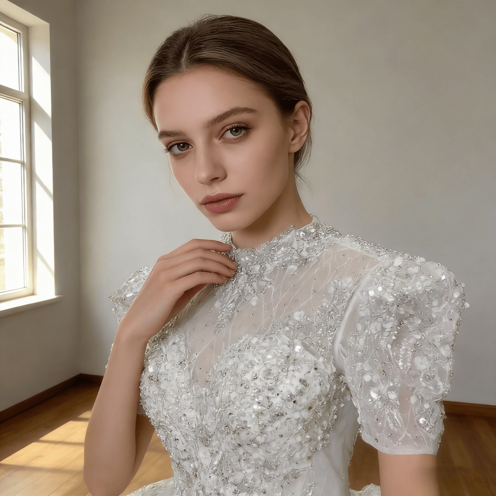 ウエディングドレス オフホワイト 短袖 ハイネック 憧れのドレス 韓国風ドレス 華やかなトレーン バックレス ブライダル