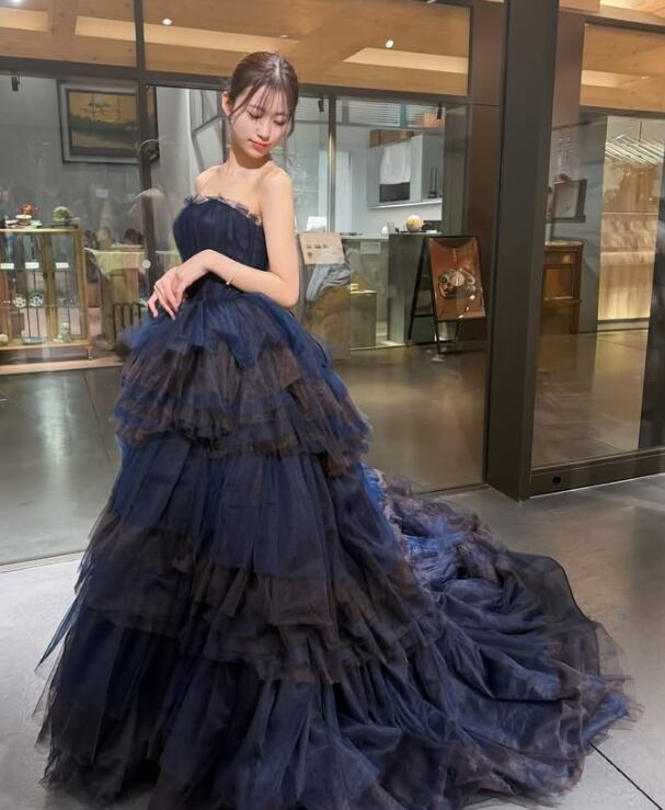 カラードレス ネイビー ブラック ビスチェドレス 華やかなトレーン ソフトチュール 花嫁 前撮り