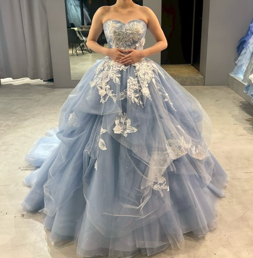 カラードレス 爽やかで優しいブルー 花柄モチーフで刺繍が美しい ビスチェドレス シークインチュール 結婚式