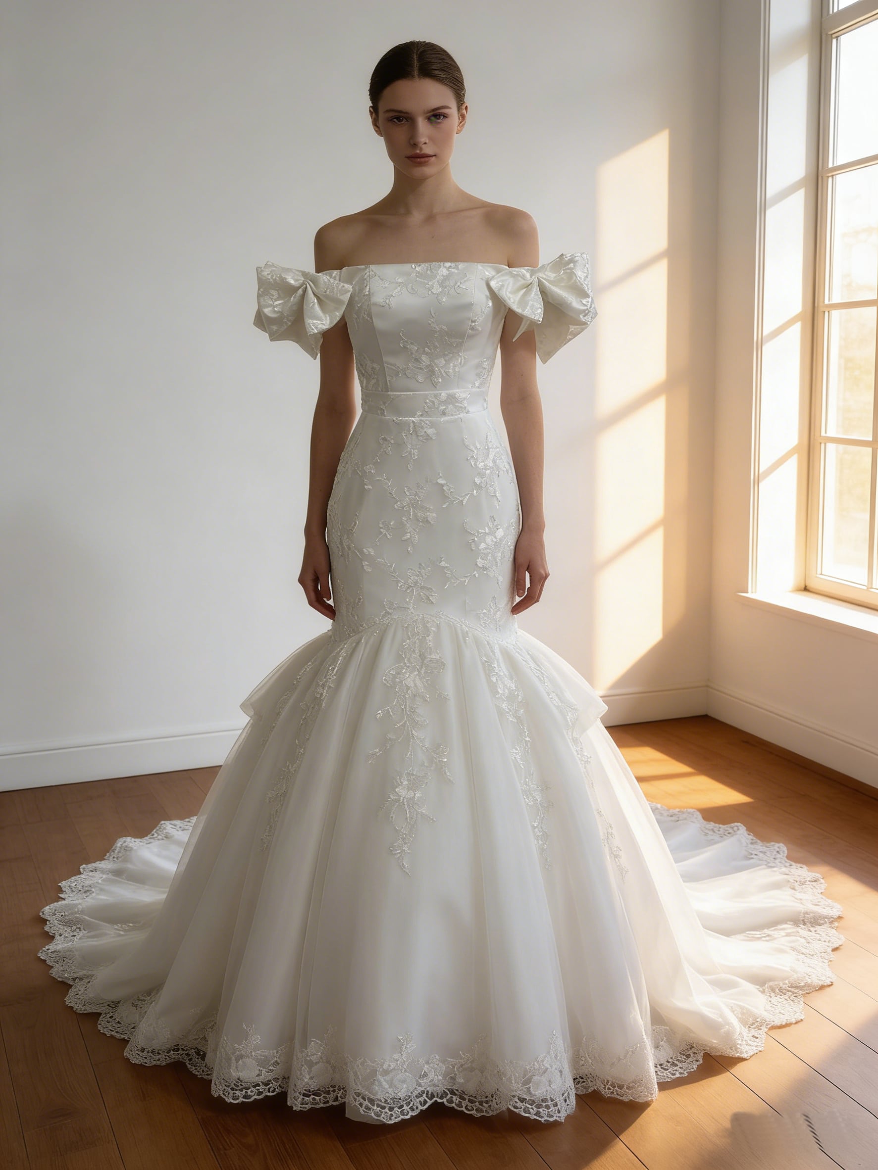 ウエディングドレス オフホワイト オフショルダー 細見えシルエット トレーン リボン 結婚式