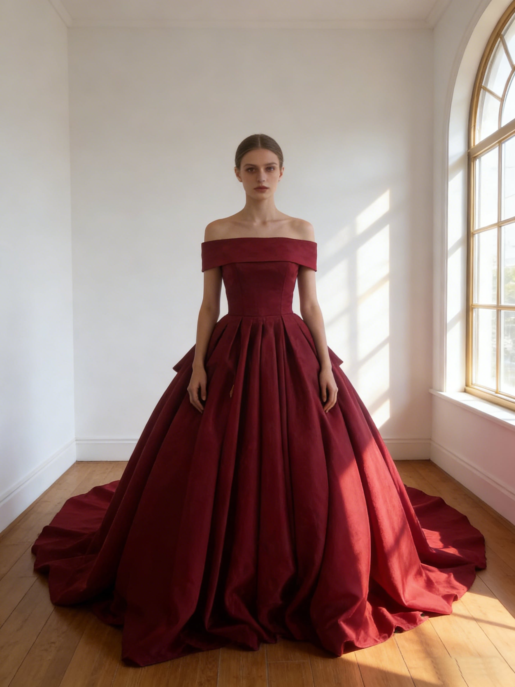 カラードレス ボルドー色 オフショルダー 光沢サテン 華やかなトレーン 花嫁 前撮り