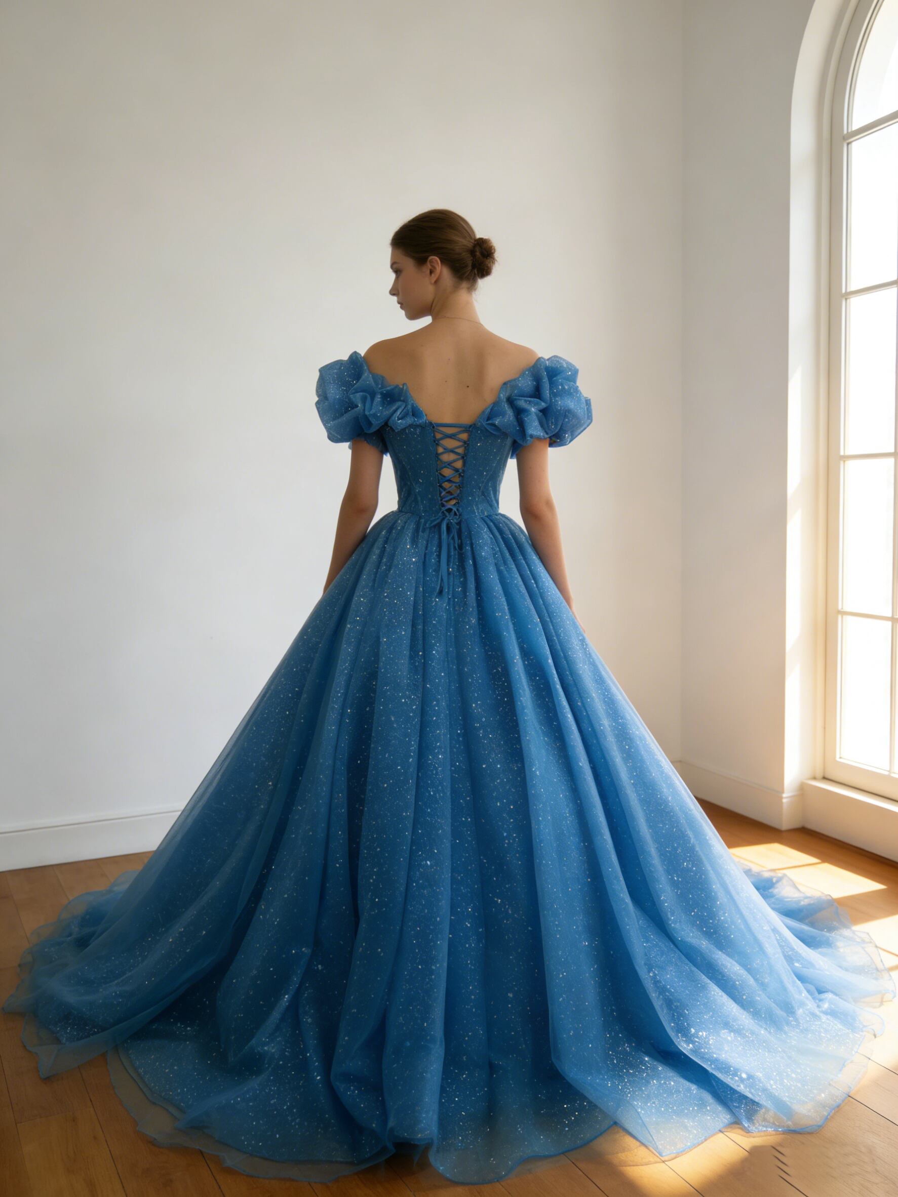 カラードレス ブルー オフショルダー 編み上げ シークインチュール 華やかなトレーン ブライダル