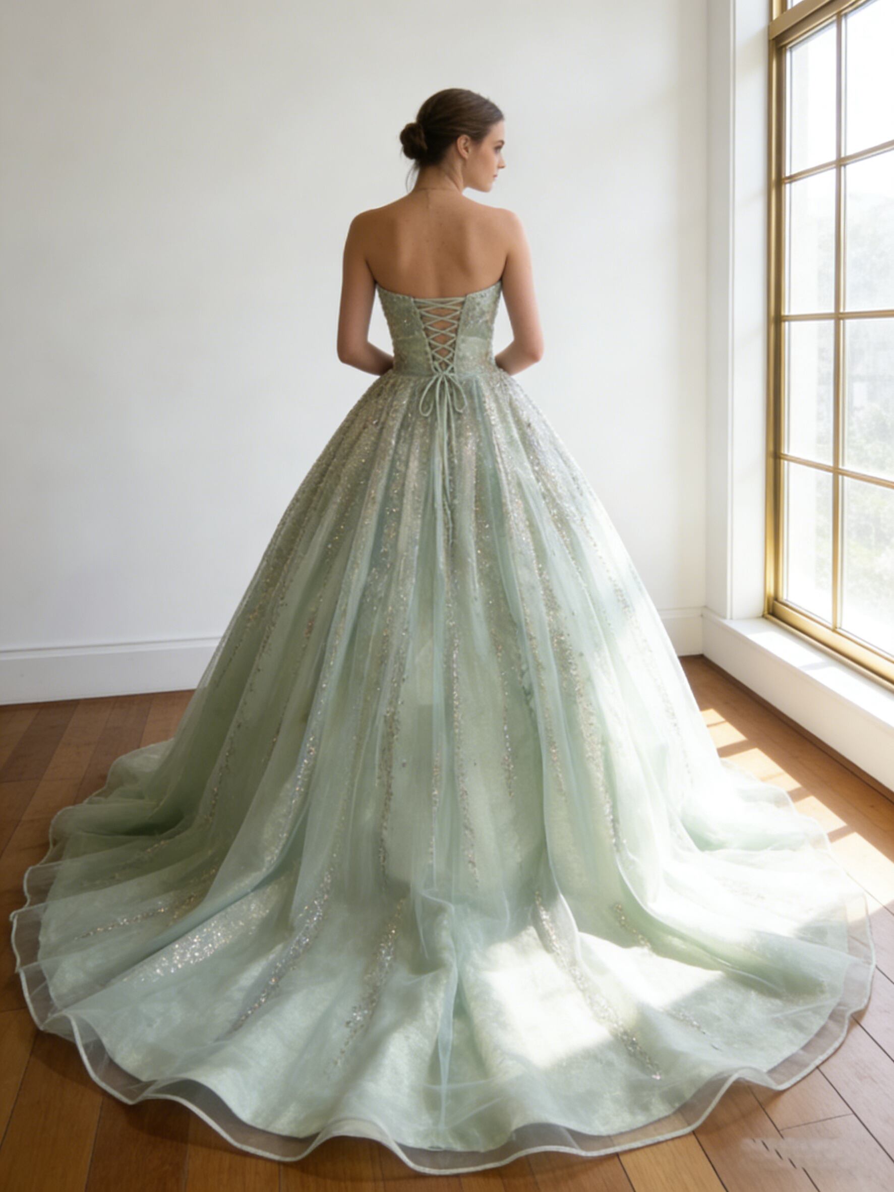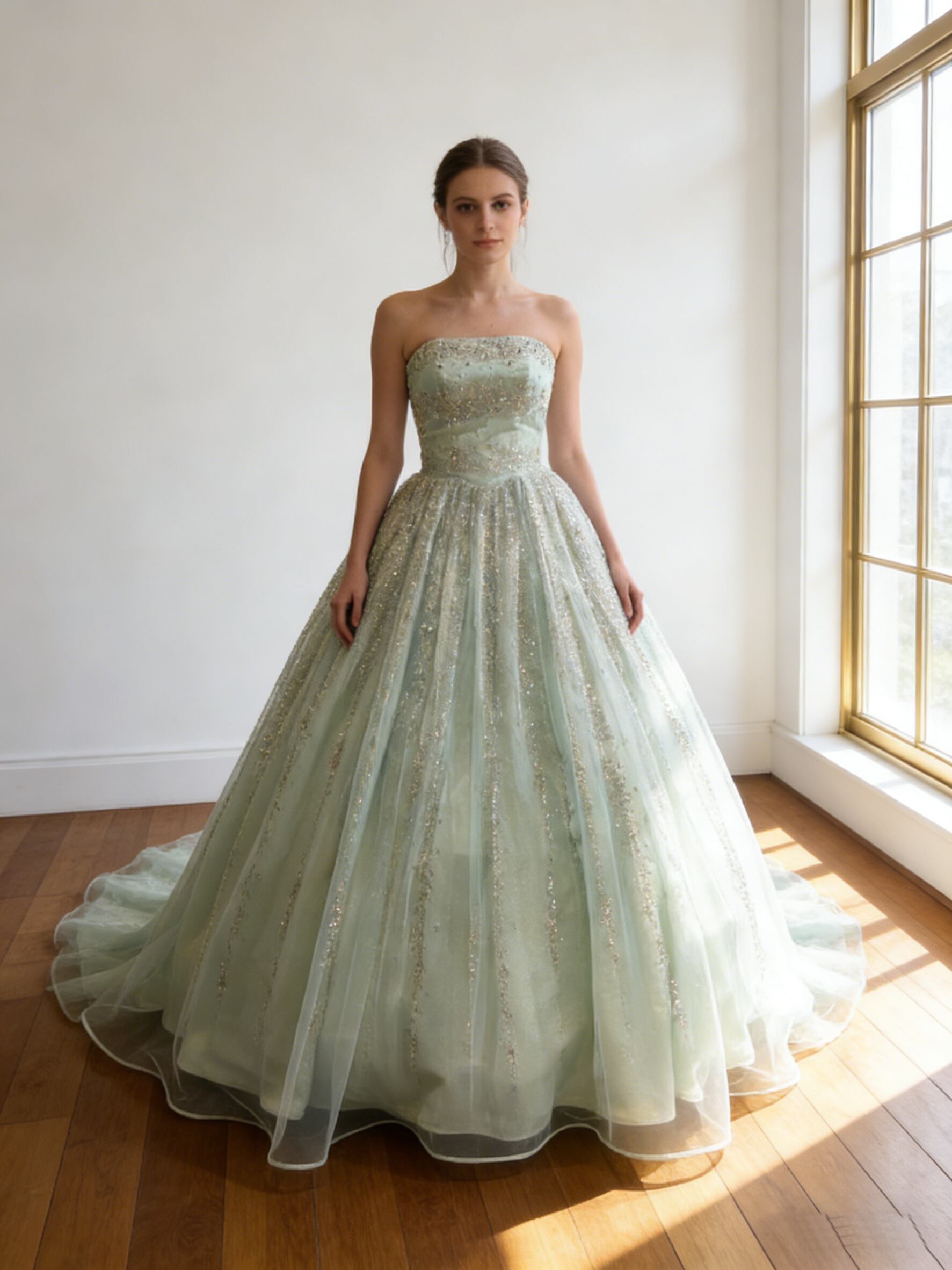 カラードレス ビスチェドレス ミントグリーンドレス キラキラ光る刺繍 ロングトレーン 花嫁 前撮り