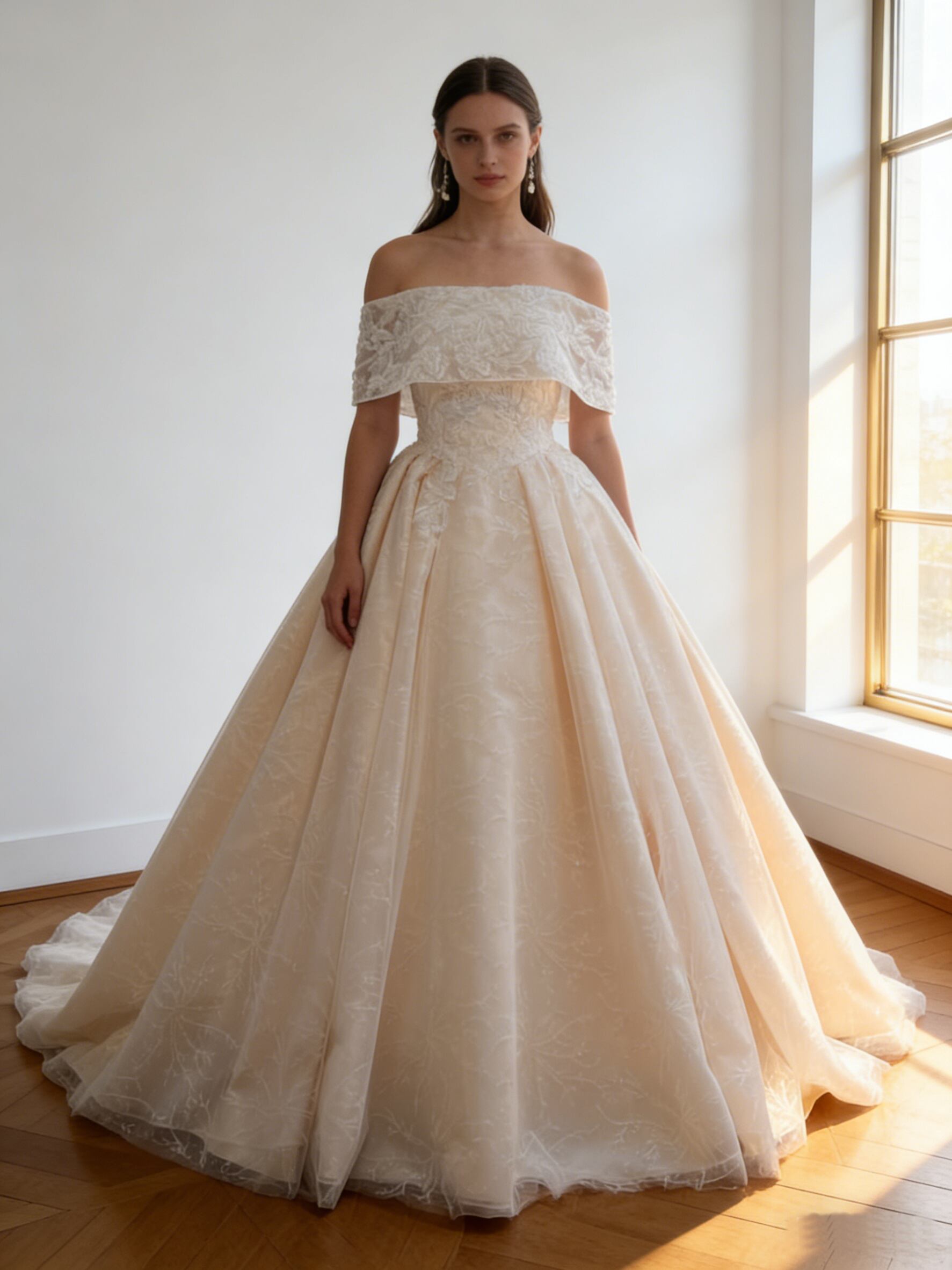 カラードレス あんず色 贅沢な総レース ロールカラー 編み上げ 華やかなトレーン 結婚式