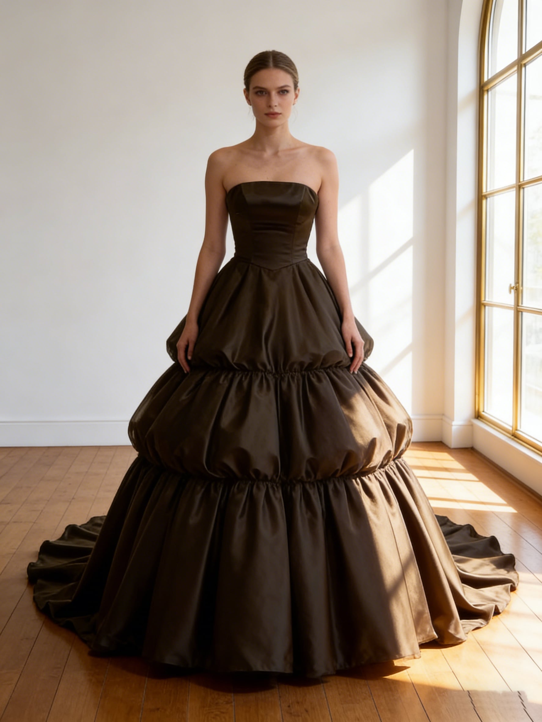 カラードレス ブラウン 光沢サテン レイヤードドレス ビスチェドレス 華やかなトレーン 編み上げ 結婚式