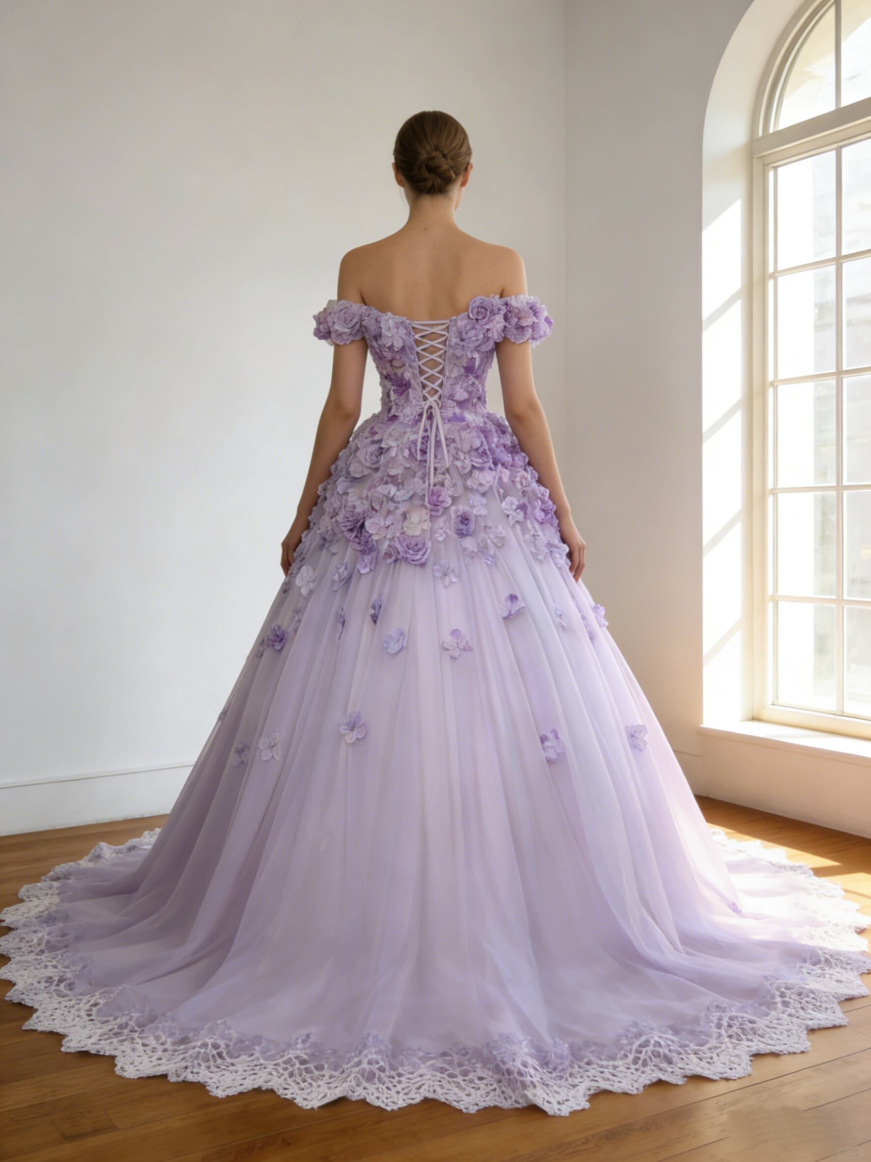 カラードレス パープル フリルオフショルダー バラトレーン 編み上げ 華やかなトレーン 結婚式