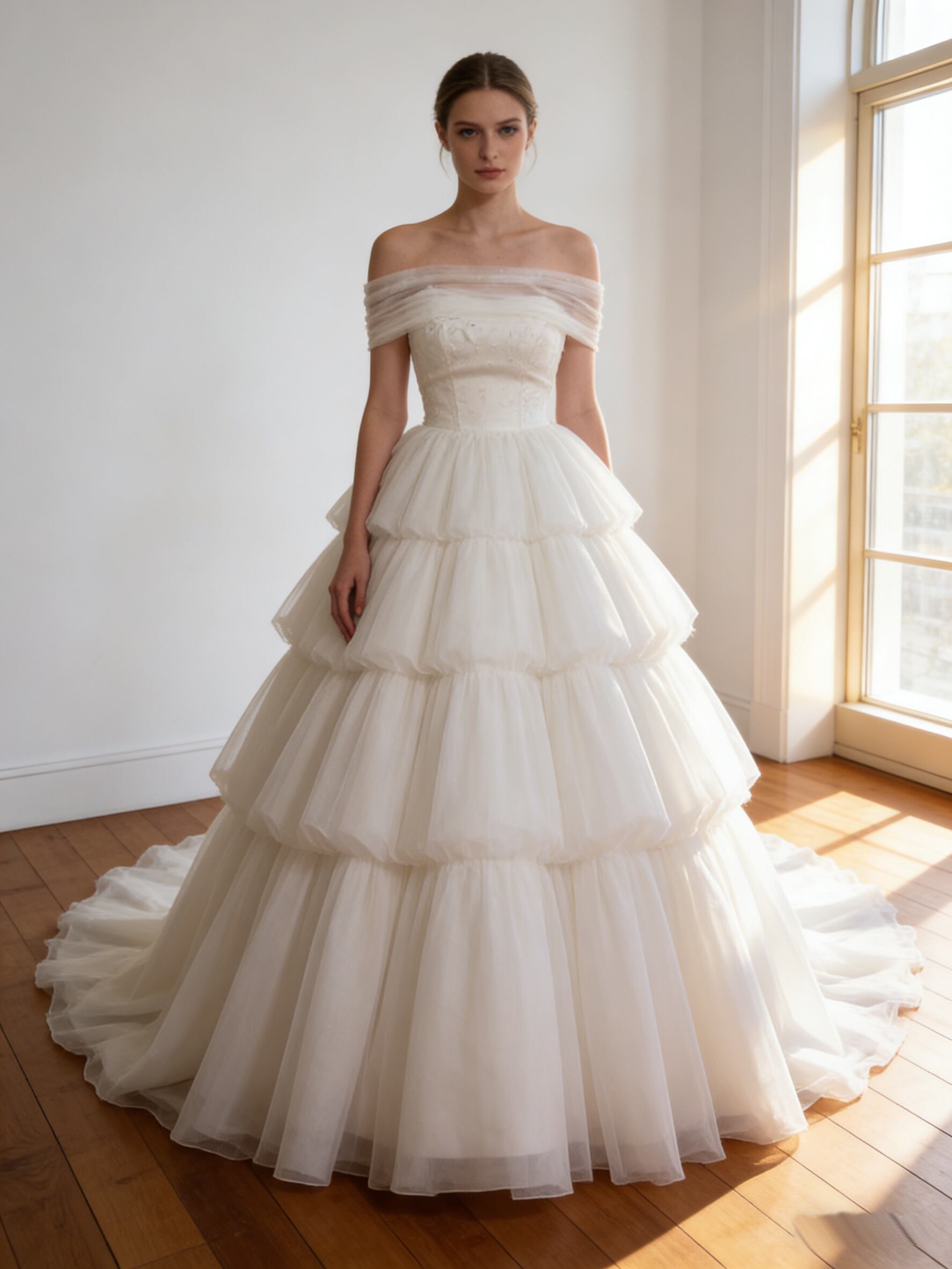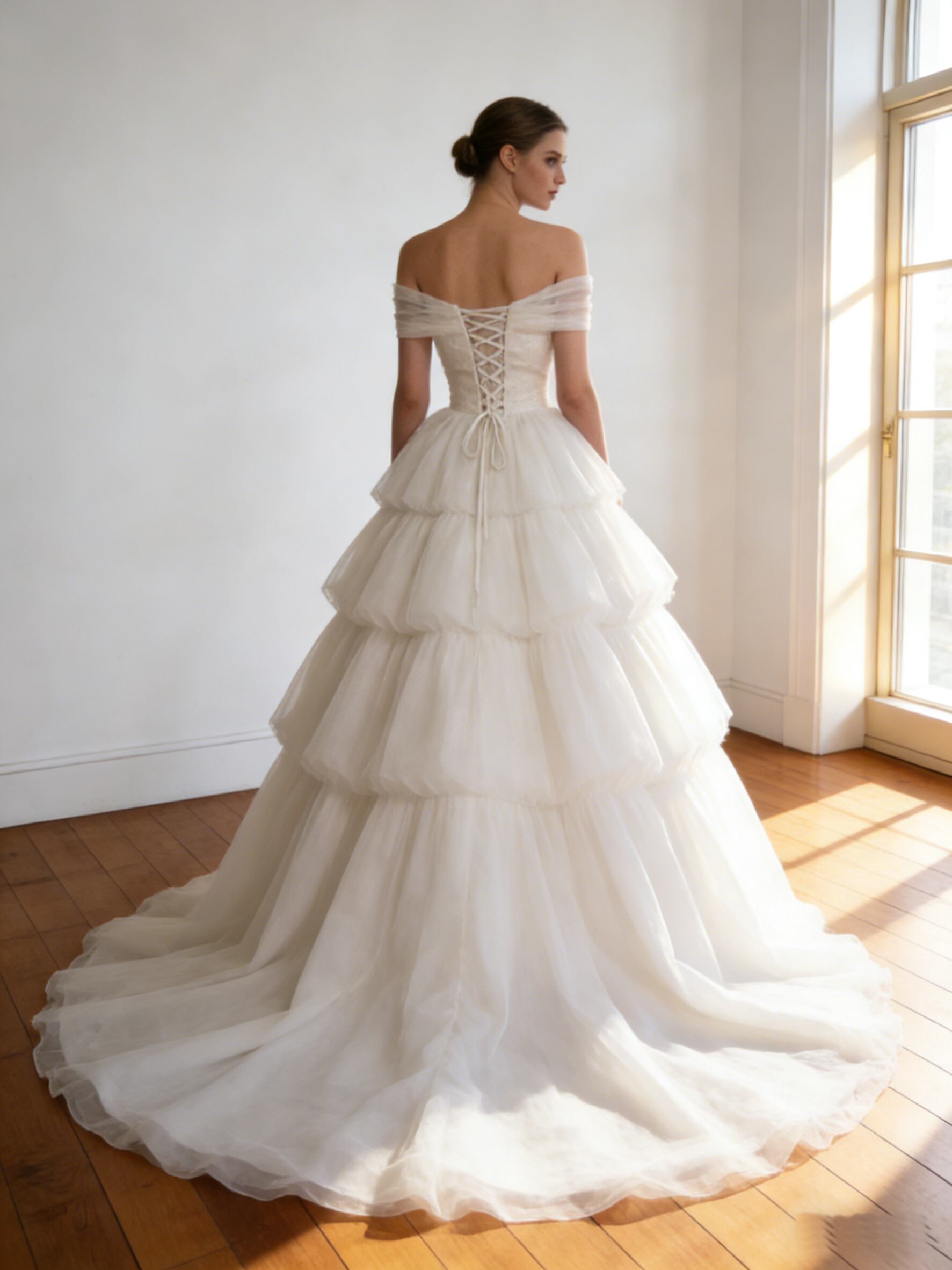 ウエディングドレス オフホワイト オフショルダー クラシカル 華やかなトレーン 編み上げ 結婚式
