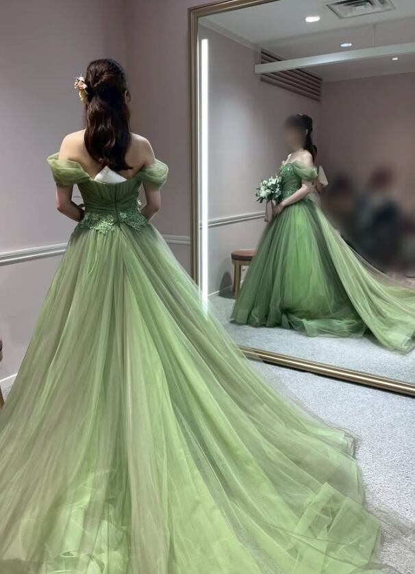 カラードレス グリーン オフショルダー 裾に繊細レースをあしらった ソフトチュール 結婚式
