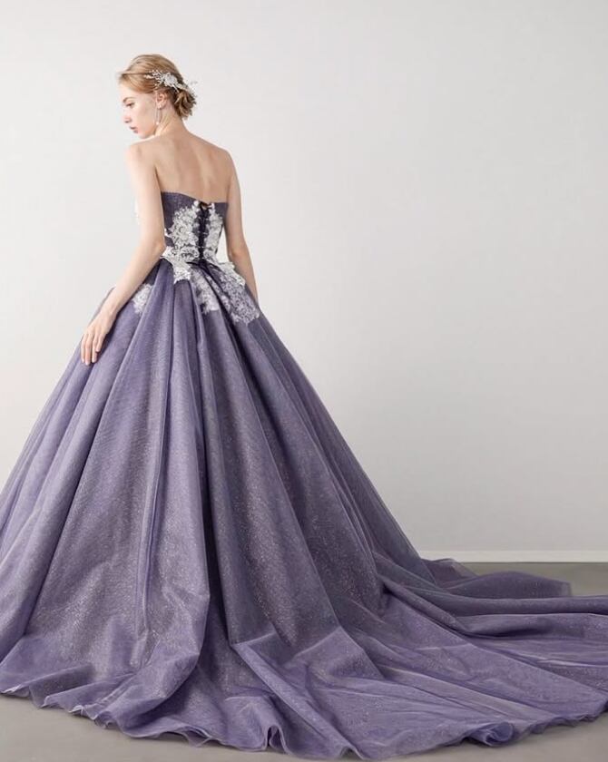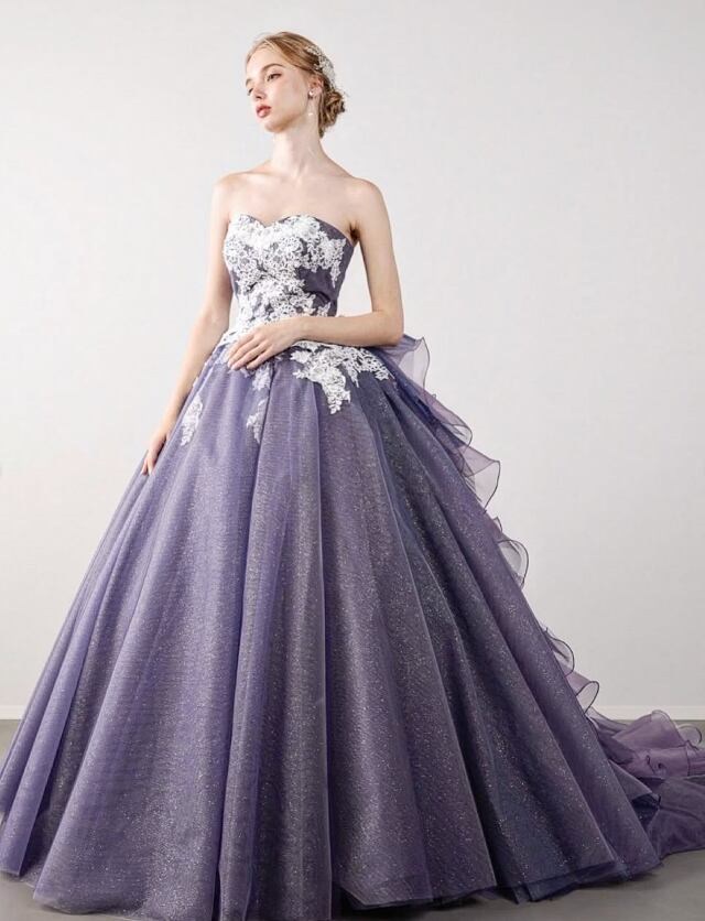カラードレス パープル 花柄モチーフで刺繍が美しい 取り外し可能な襟 編み上げ 華やかなトレーン ラッフルフリル 花嫁