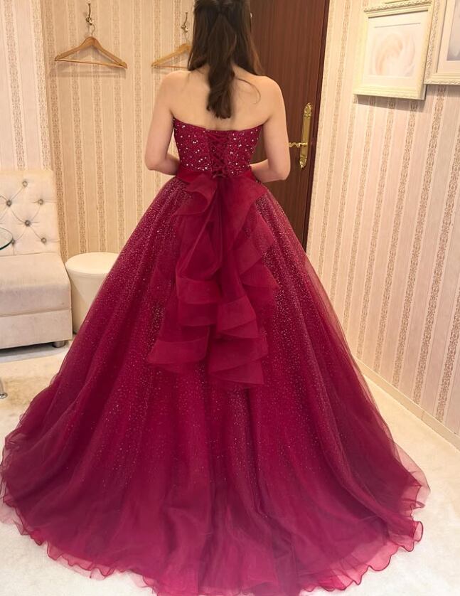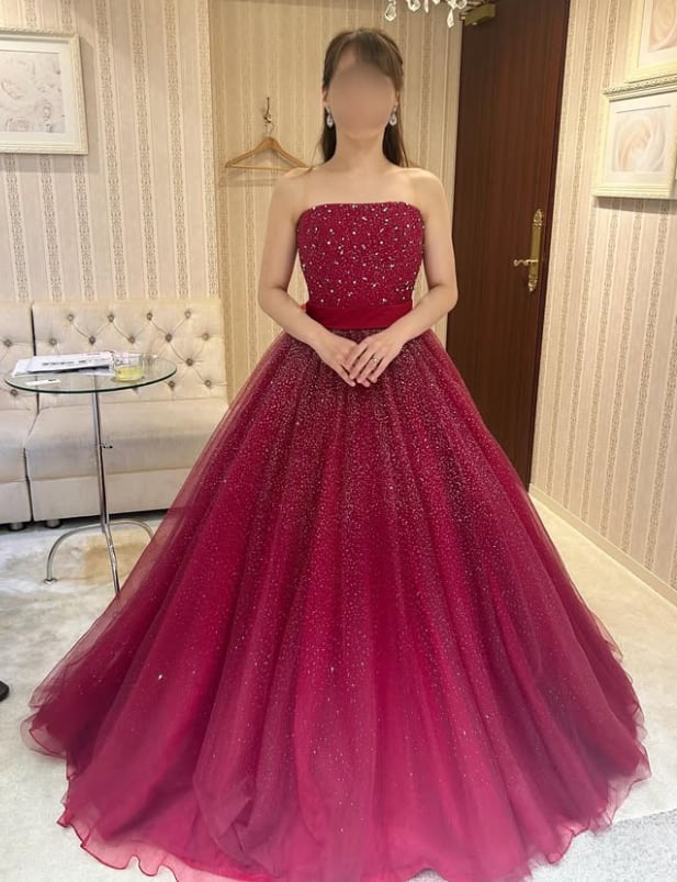 カラードレス ボルドー色 シークインチュール 立体ドレープ 編み上げ トレーン ビスチェドレス 花嫁 前撮り