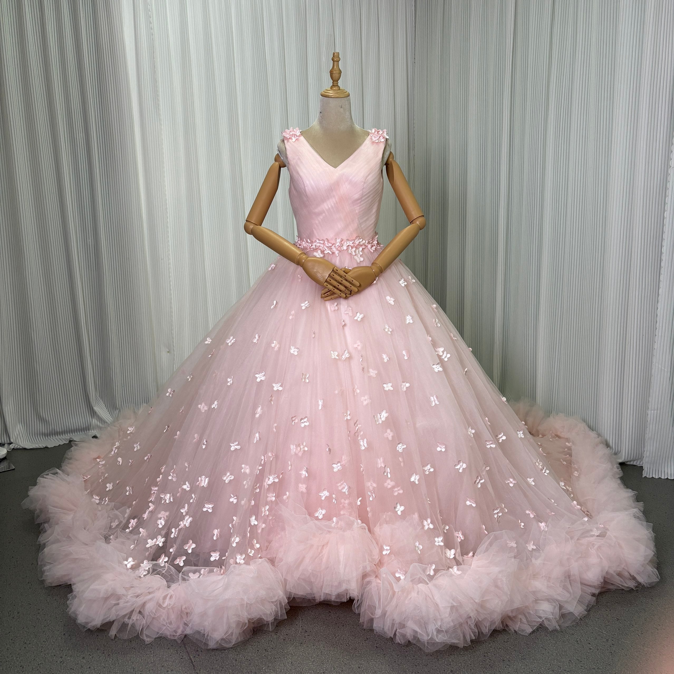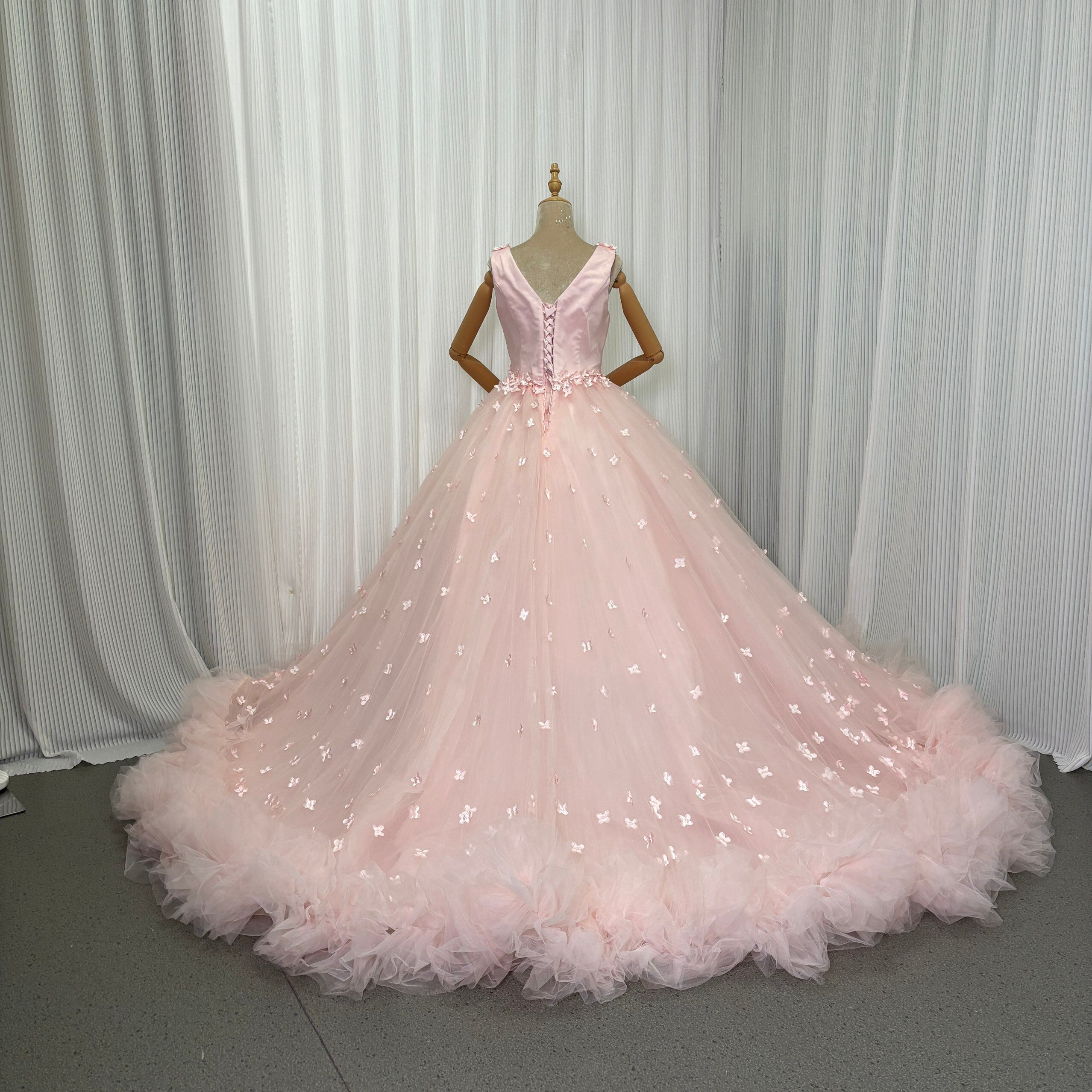 カラードレス ピンク 花モチーフ 編み上げ ボリュームドレス キャミソール 華やかなトレーン 花嫁 前撮り