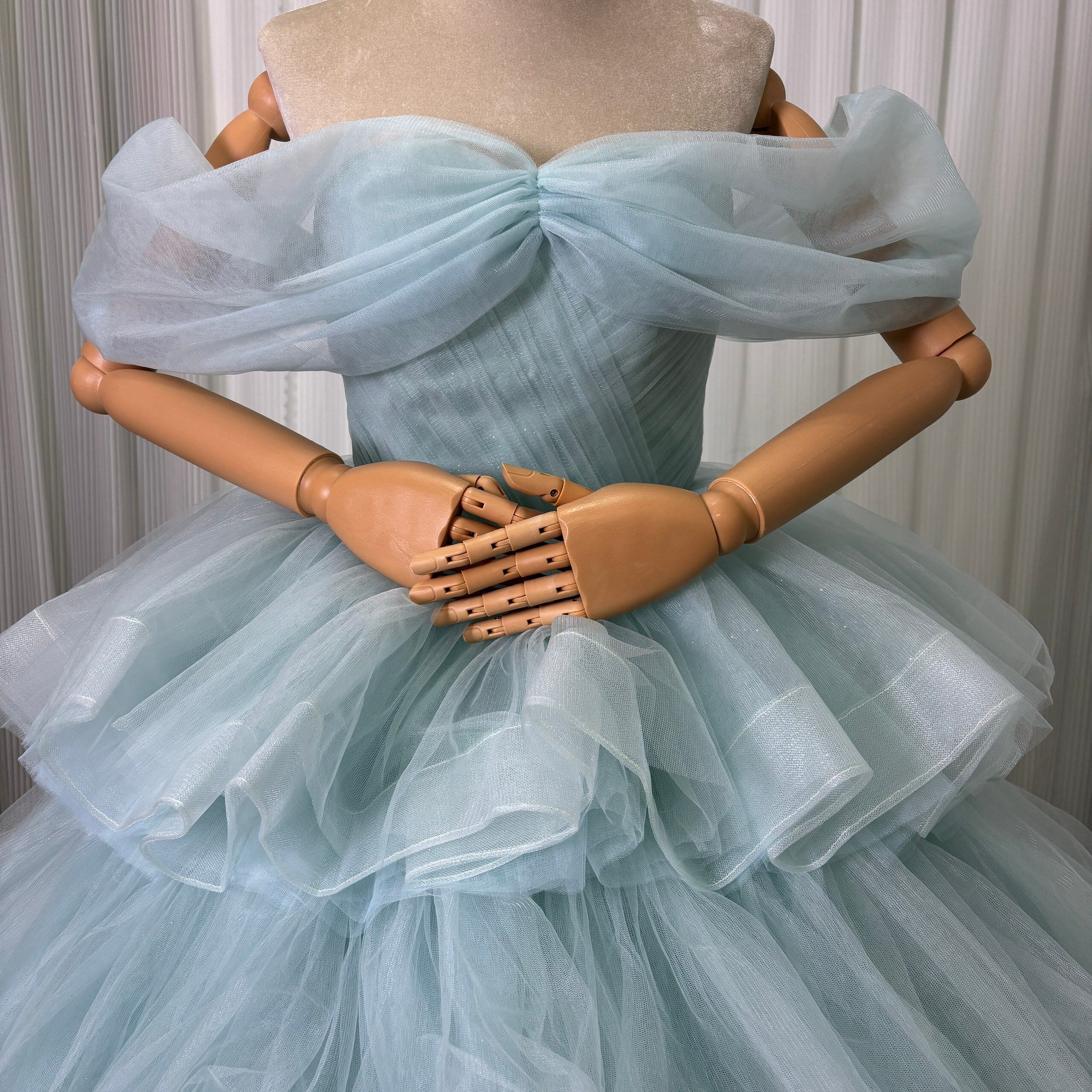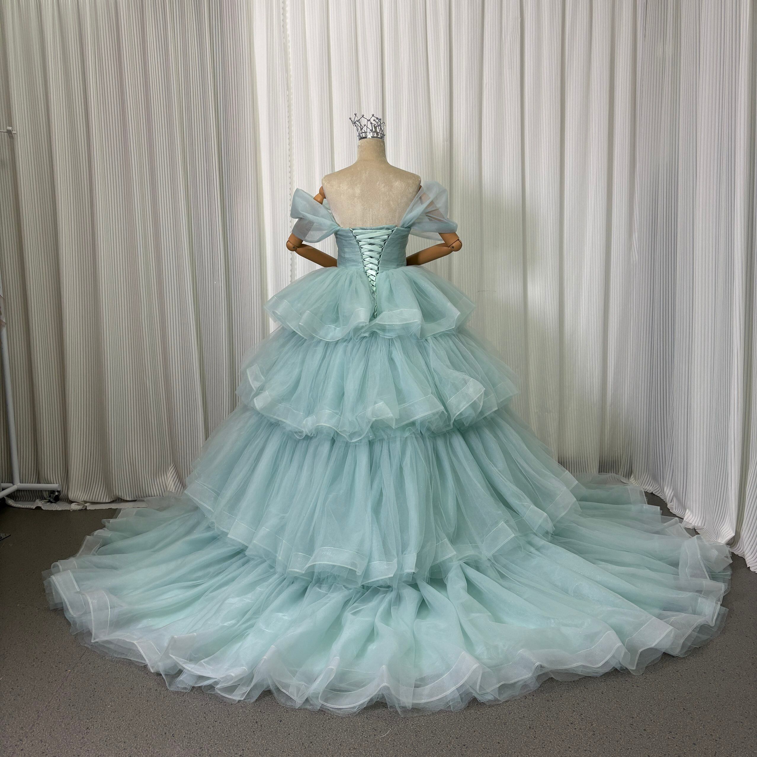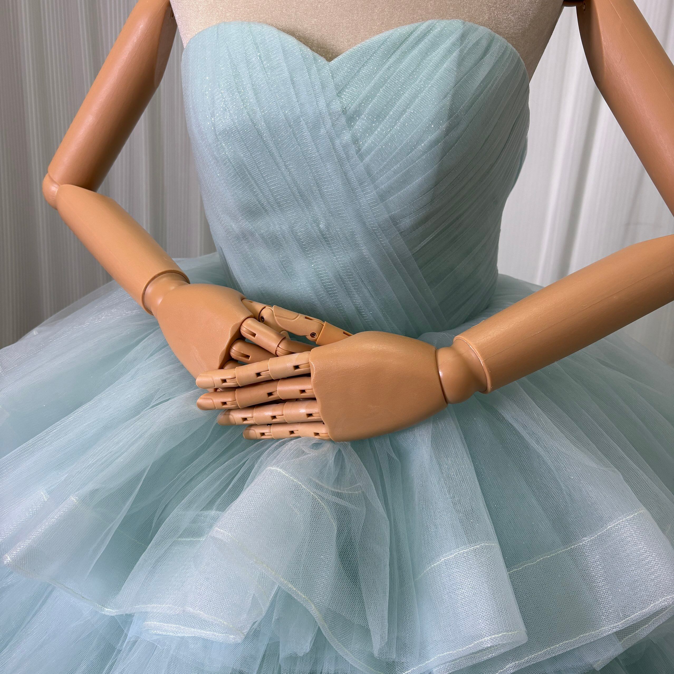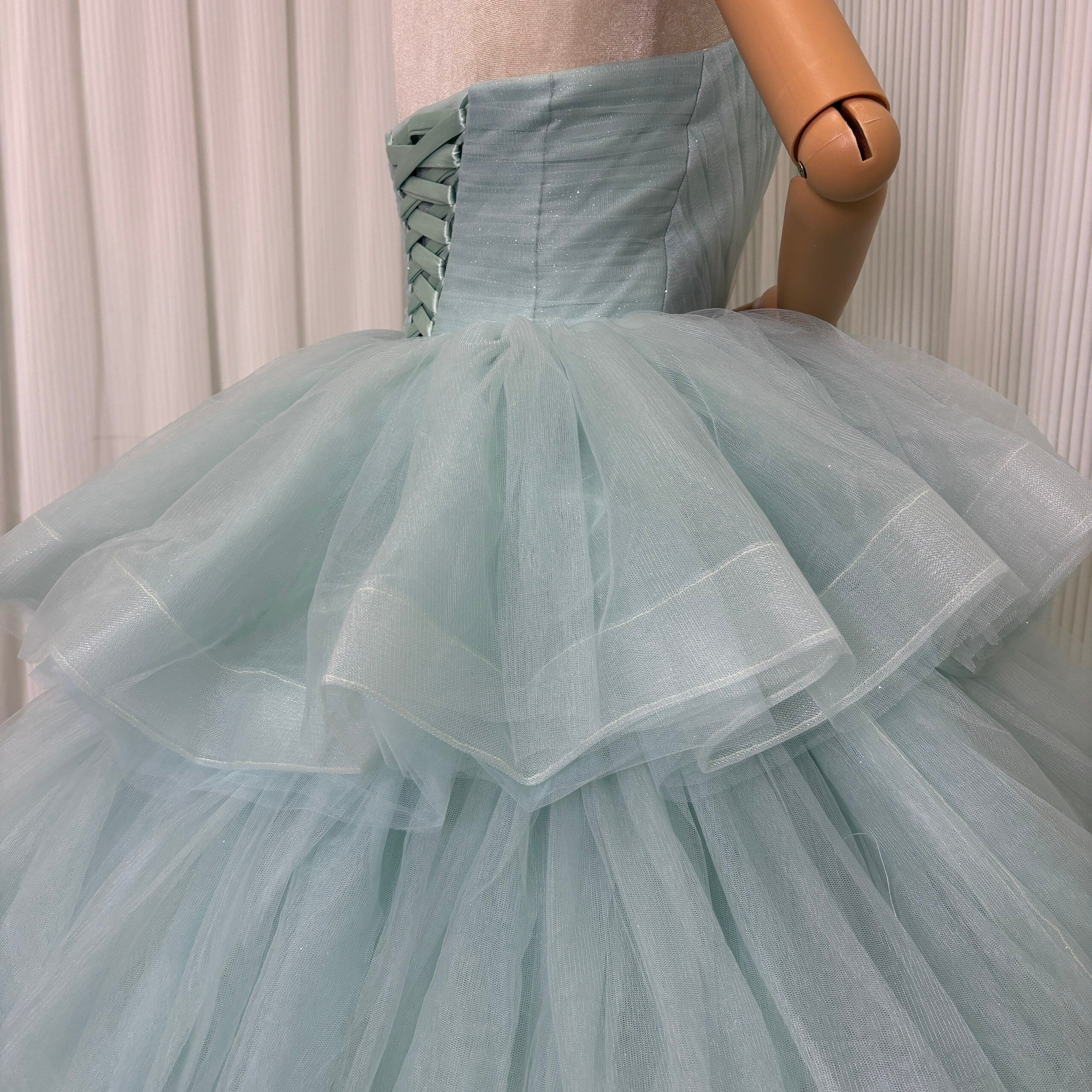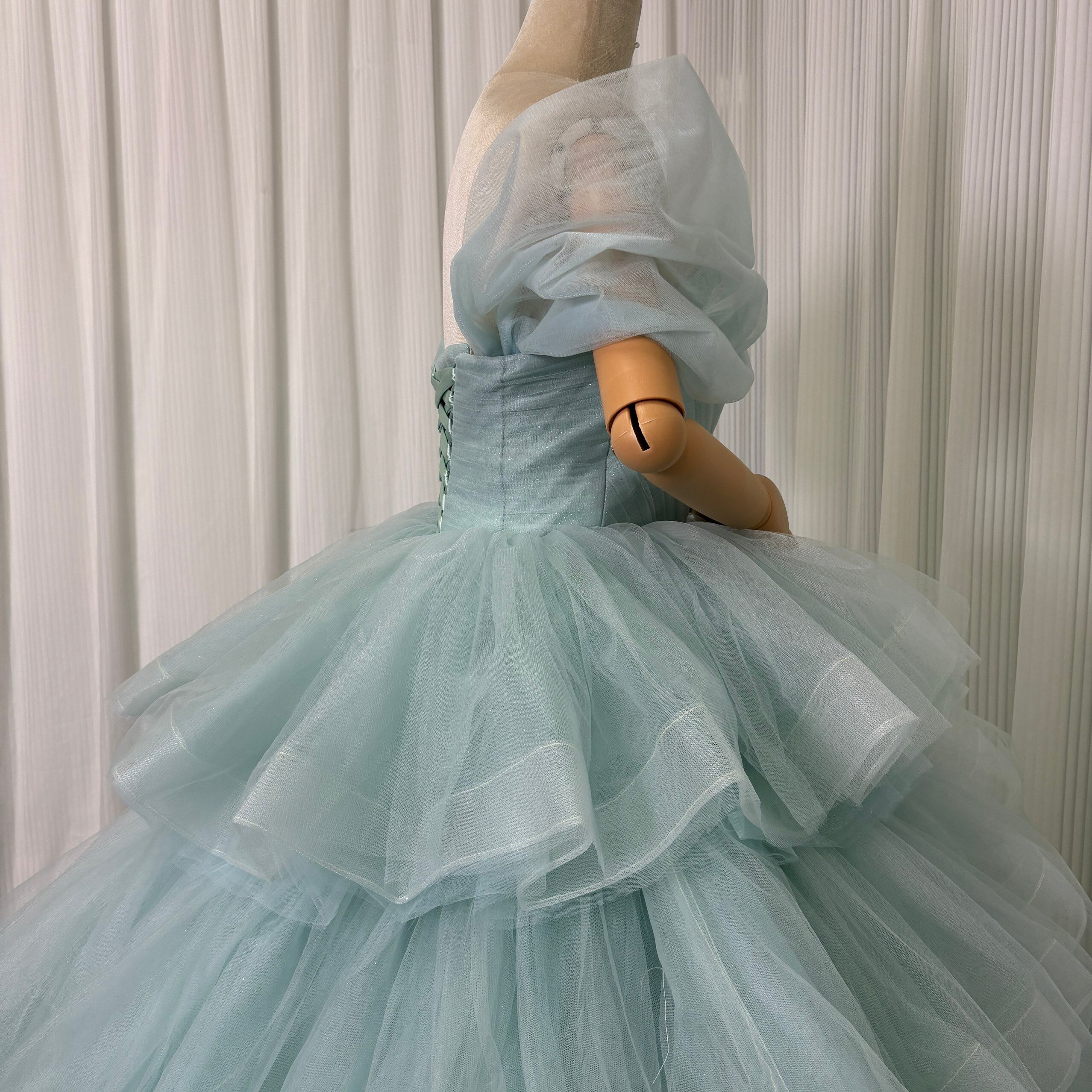 カラードレス グリーン 取り外し可能なオフショルダー シークインチュール ボリュームドレス 編み上げ 結婚式