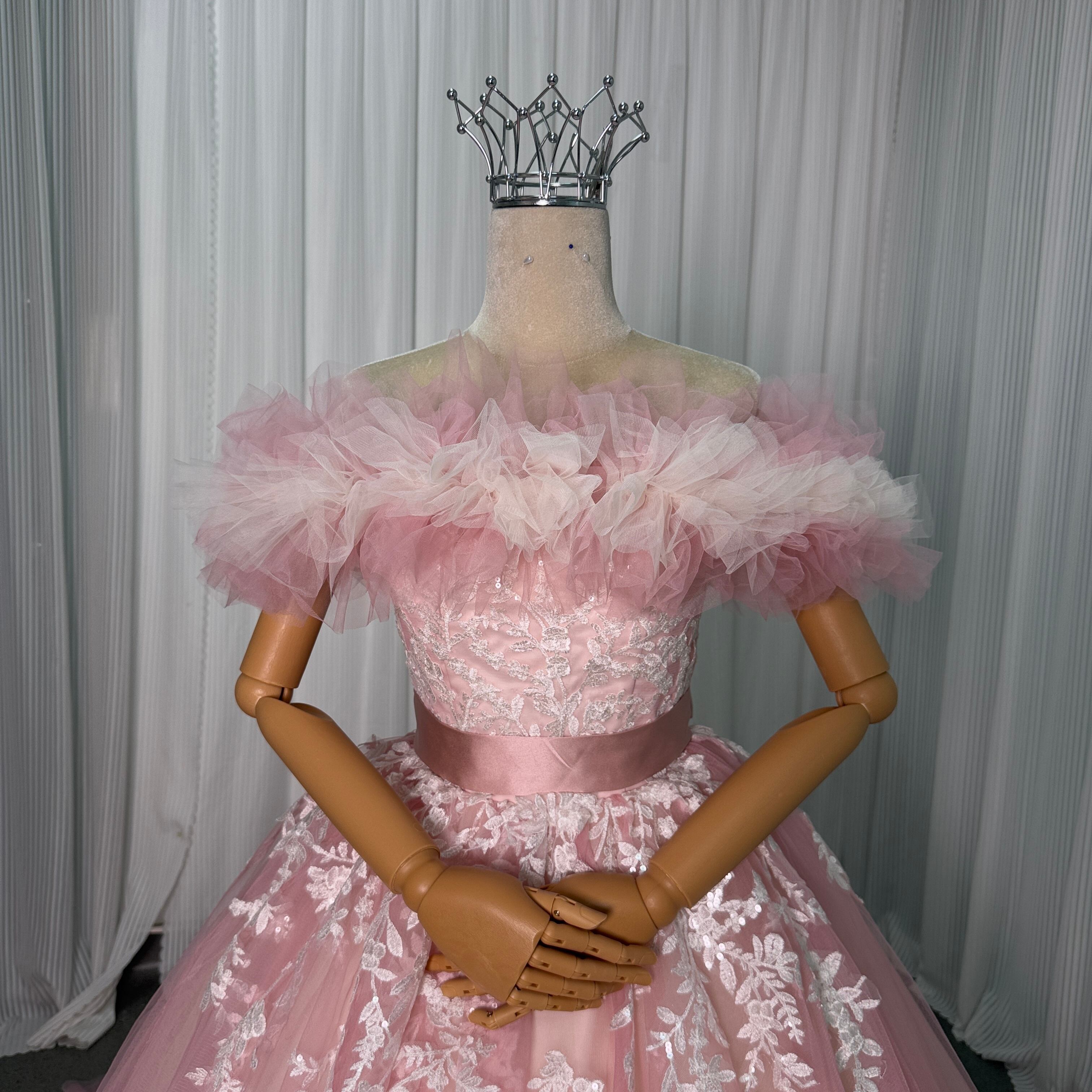 カラードレス ピンク 繊細なレース 取り外し可能なオフショルダー 華やかなトレーン 編み上げ サッシュベルト 結婚式 前撮り