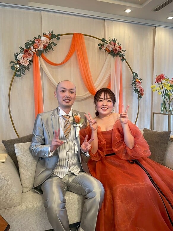 実例写真!カラードレス オレンジ 上質オーガンジー 取り外し可能な付け袖 サッシュベルト 花嫁 前撮り