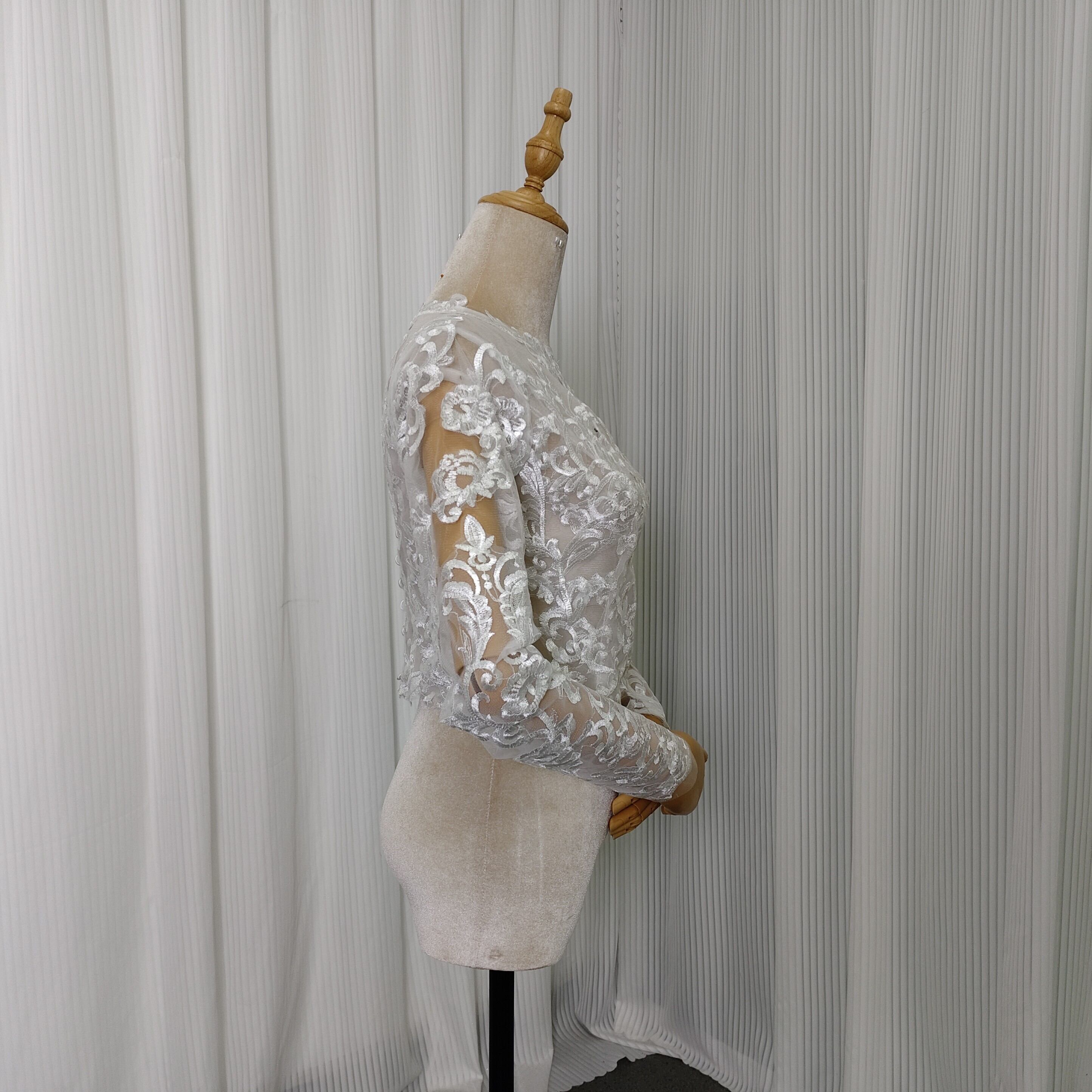 幻想的な輝きトップス オフホワイト ロングスリーブ 贅沢な総レース くるみボタン+ファスナー 結婚式