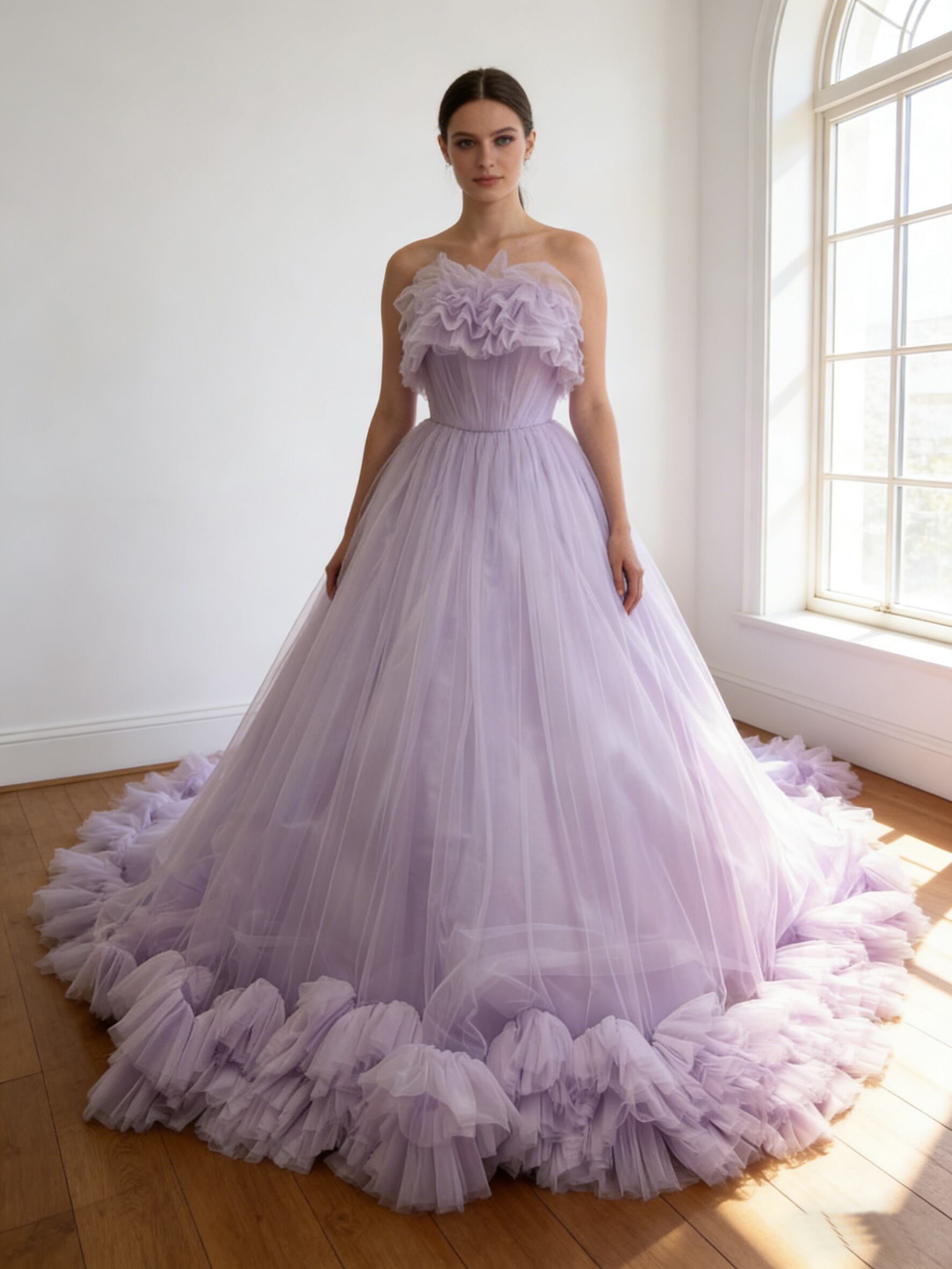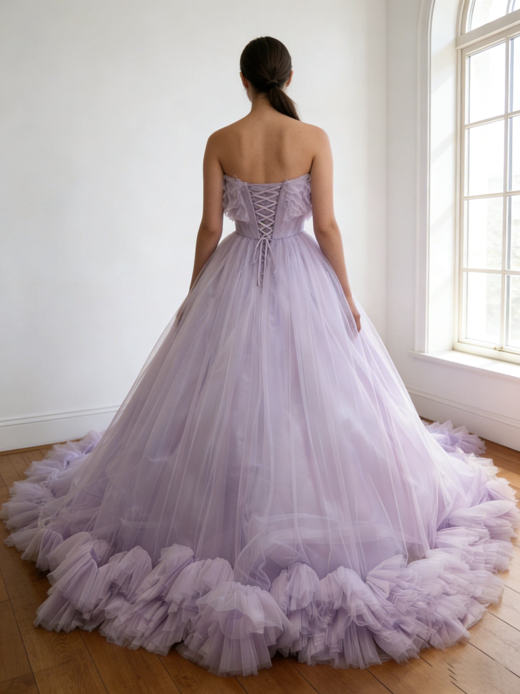 カラードレス パープル ソフトチュール フリルトレーン 編み上げ ビスチェドレス 花嫁 前撮り
