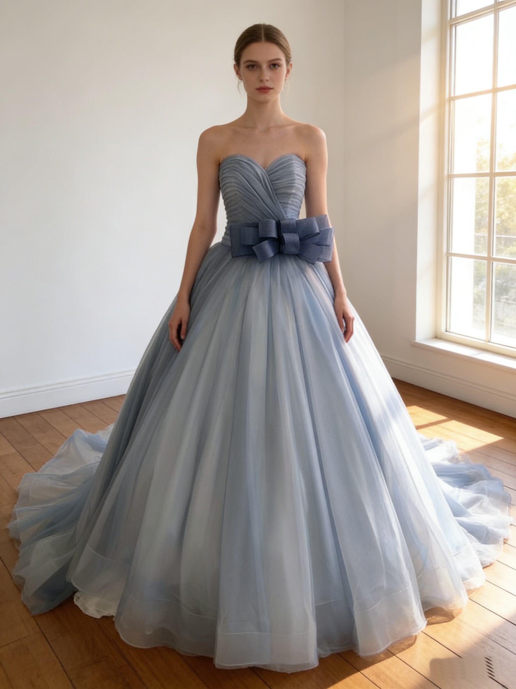 カラードレス ブルーグレー スリット ふっくら柔らかなバックリボン 華やかなトレーン 編み上げ ビスチェドレス 花嫁 前撮り
