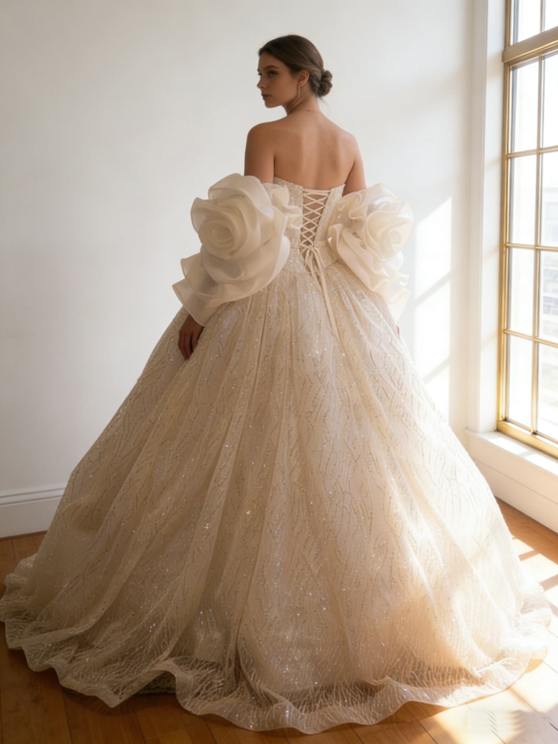カラードレス あんず色 シークインチュール 取り外し可能な付け袖 編み上げ 華やかなトレーン 結婚式