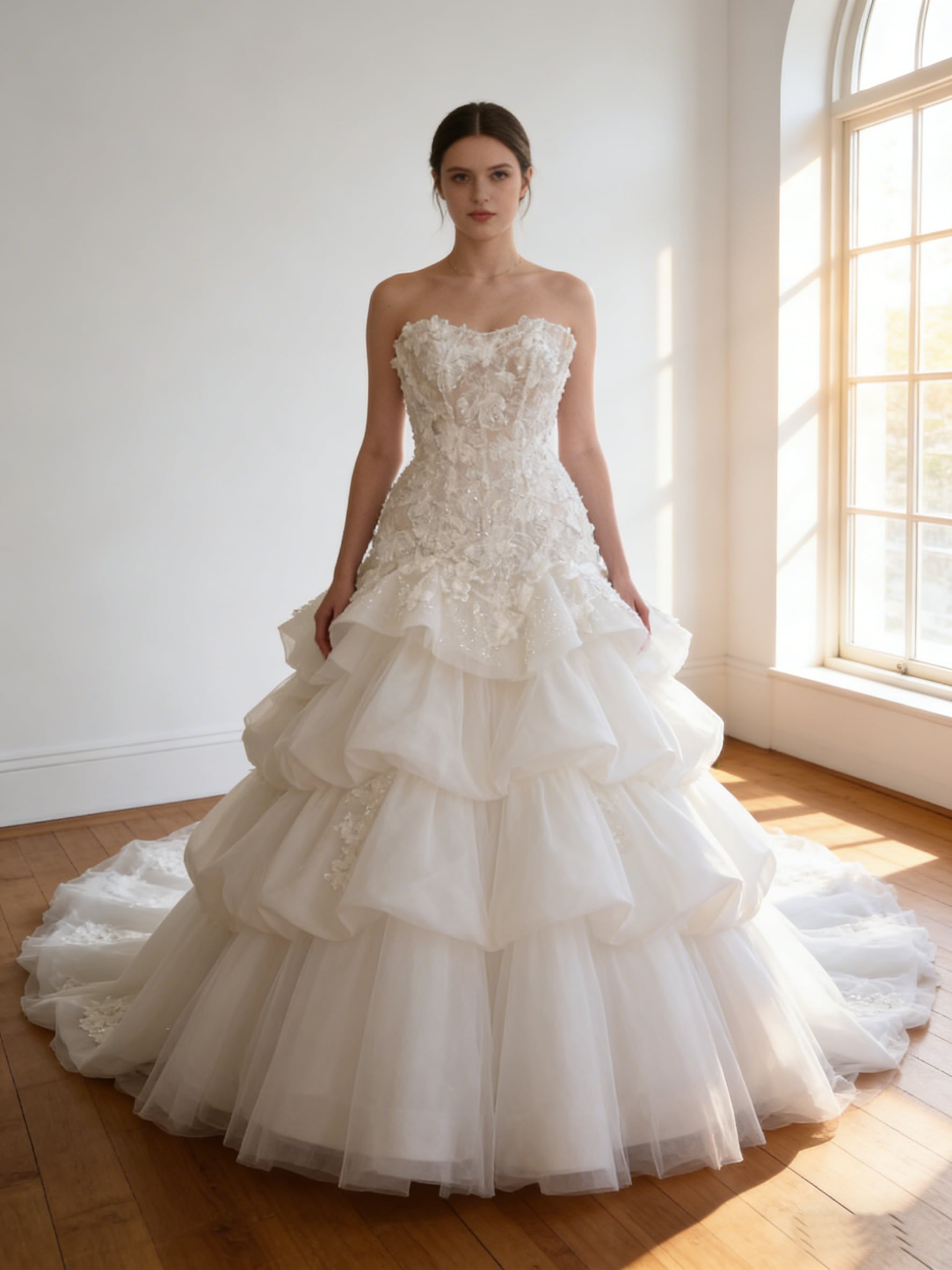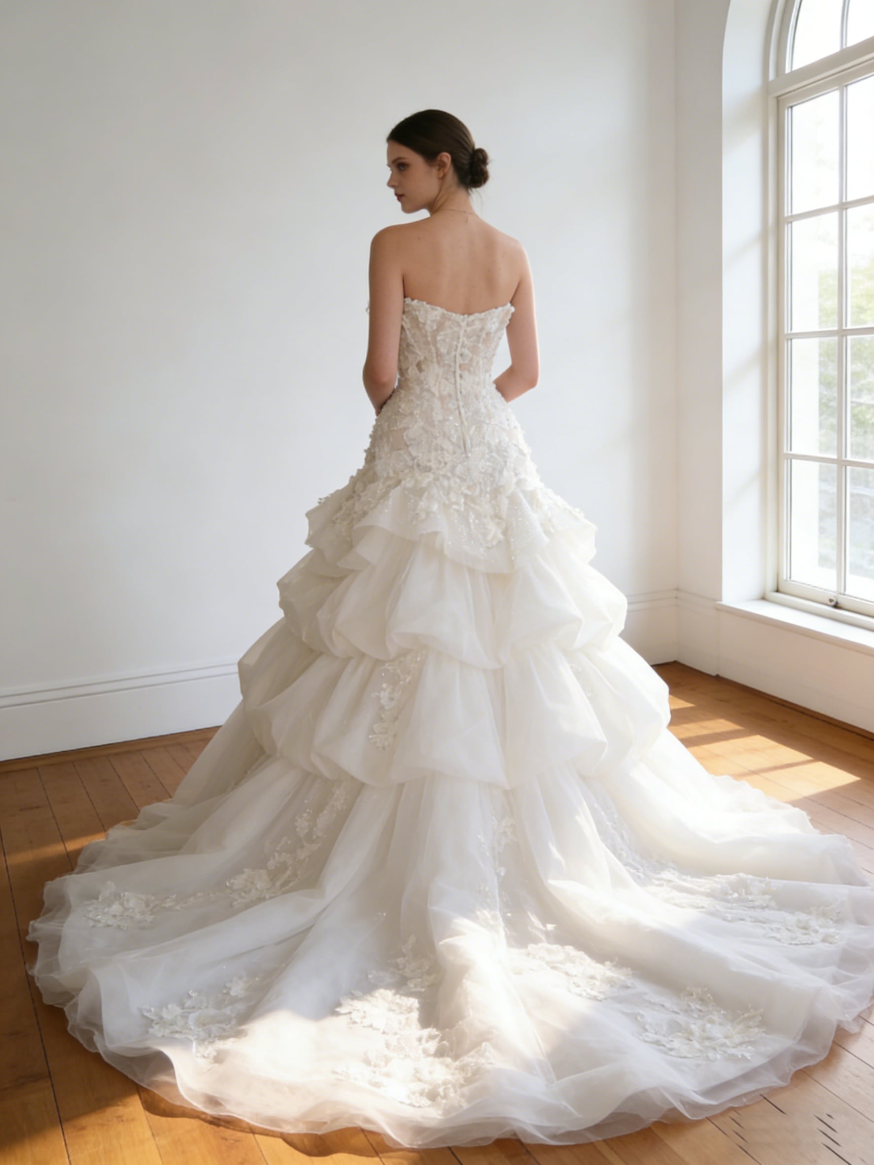 ウエディングドレス オフホワイト 3D立体レース刺繍 韓国風ドレス 繊細なレース 細見えシルエット ビスチェドレス 結婚式