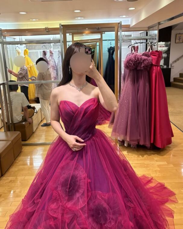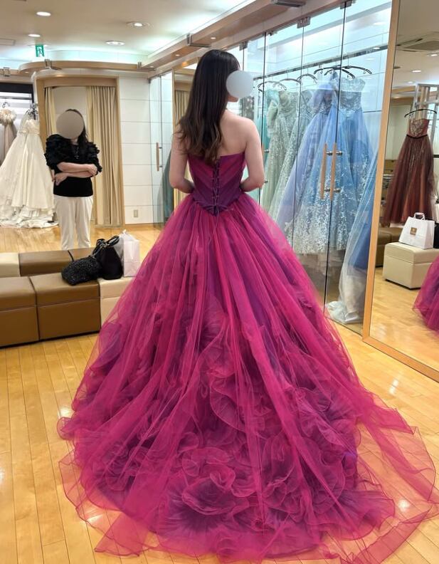 カラードレス ピンク バラトレーン ソフトチュール 華やかなトレーン ビスチェドレス 結婚式