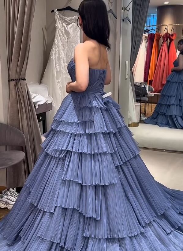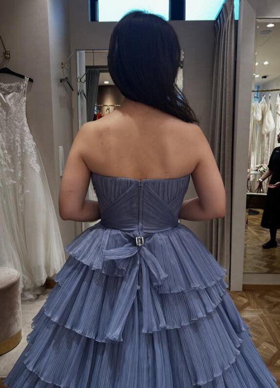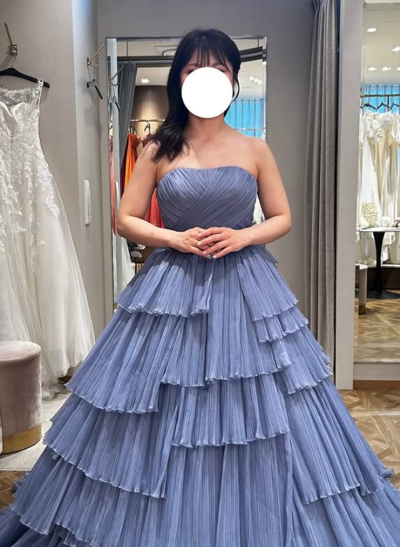 カラードレス 爽やかで優しいブルー ファスナー アシンメトリードレス ビスチェドレス ロングトレーン 花嫁