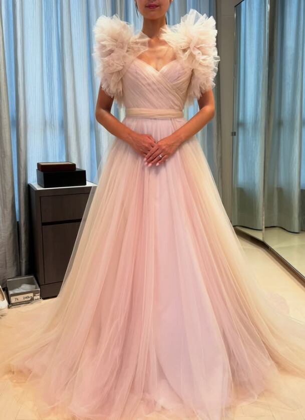 カラードレス ピンク ノースリーブ ソフトチュール 華やかなトレーン バックレス 花嫁 前撮り