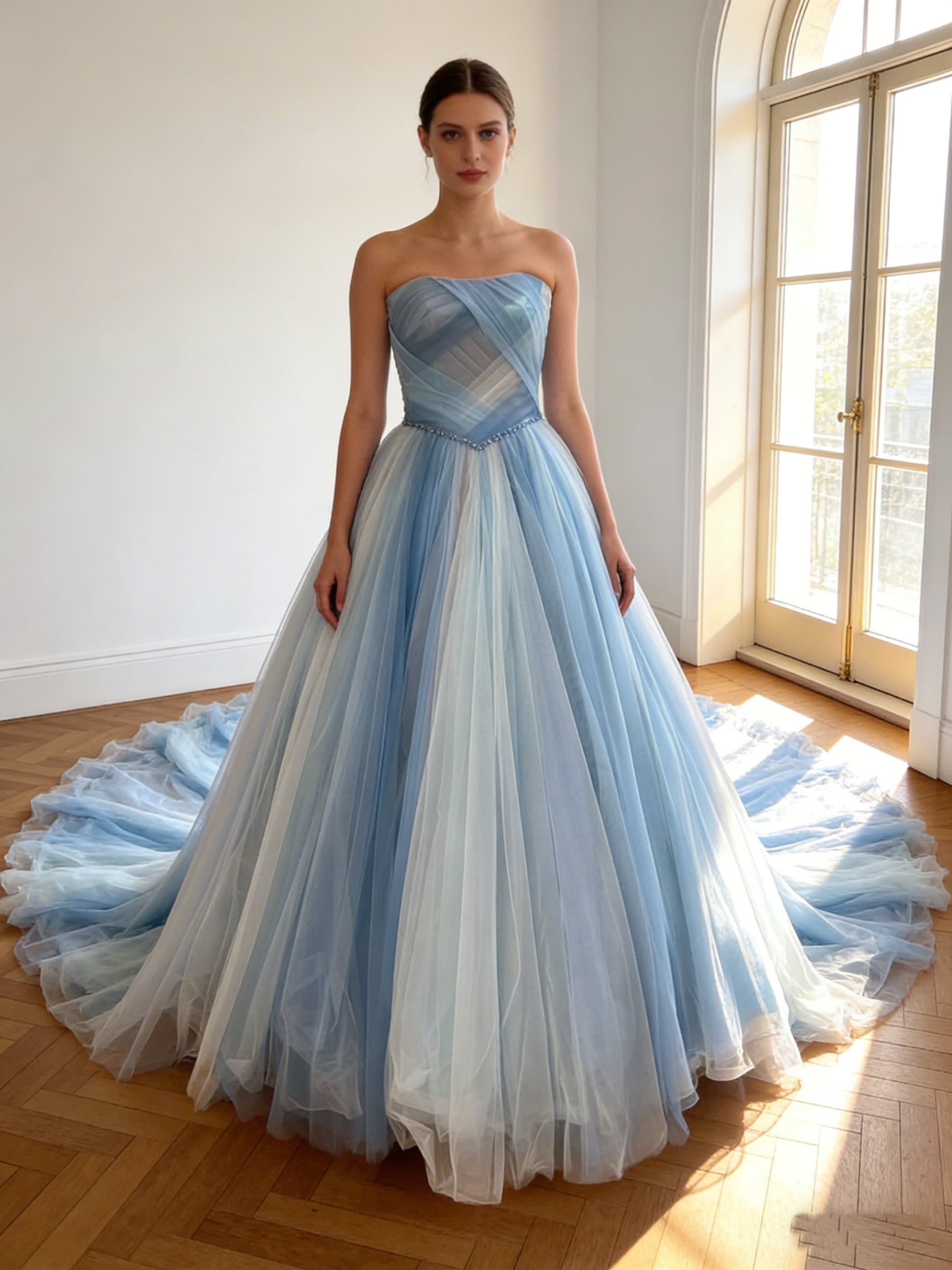 カラードレス ブルー ビ スリット スチェドレス グラデーションドレス ソフトチュール 華やかなトレーン 花嫁 前撮り