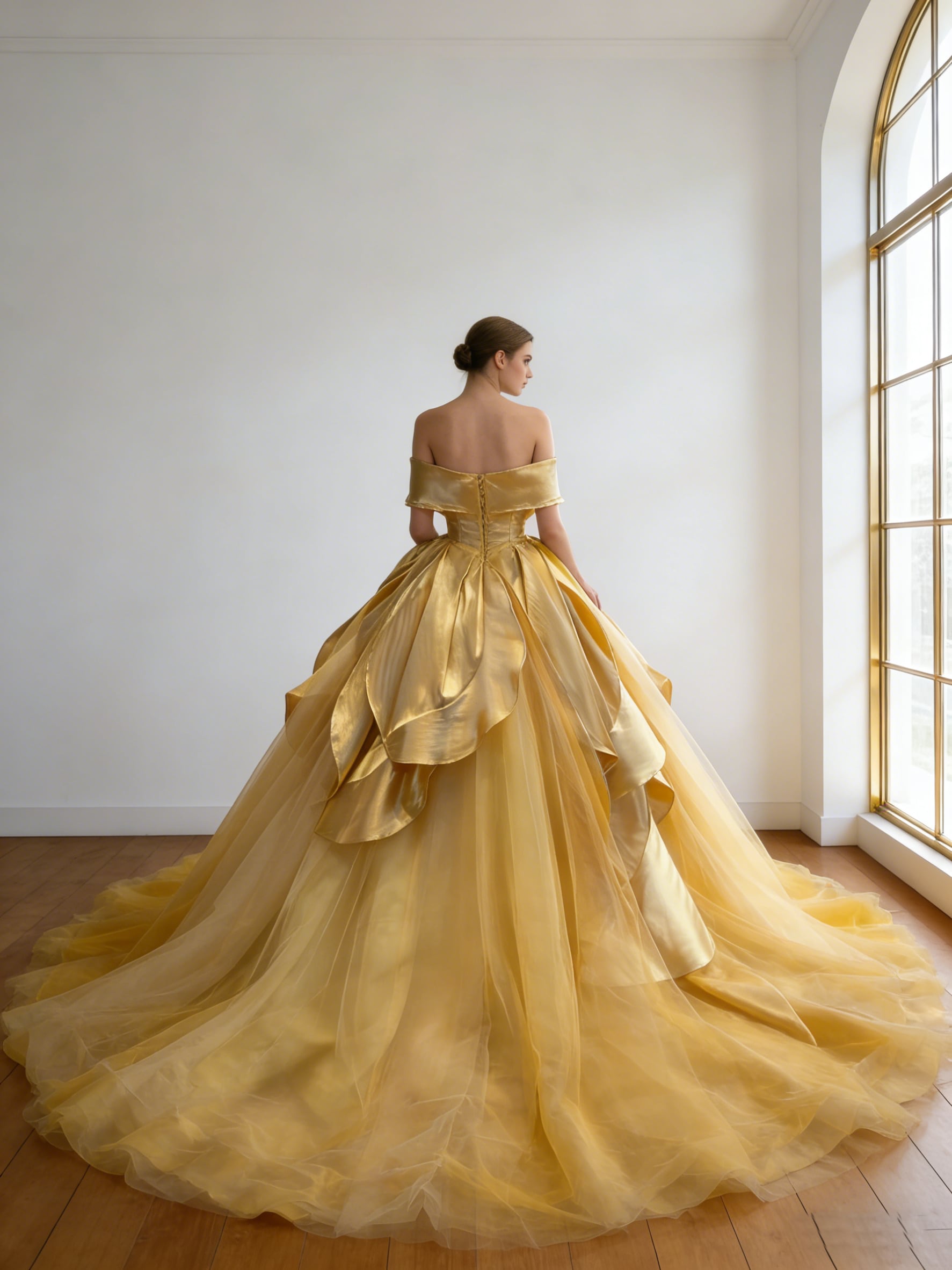 カラードレス 黄色い オフショルダー アシンメトリー風 目立つ 華やかなトレーン 花嫁 前撮り
