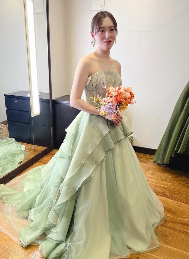 カラードレス まっちゃ色 ウェーブ 上質オーガンジー グラデーションドレス 華やかなトレーン ビスチェドレス 音楽会