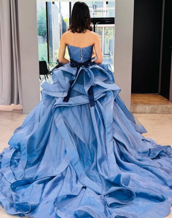 カラードレス 爽やかで優しいブルー 立体ドレープ サッシュベルト 華やかなトレーン ビスチェドレス 花嫁 前撮り