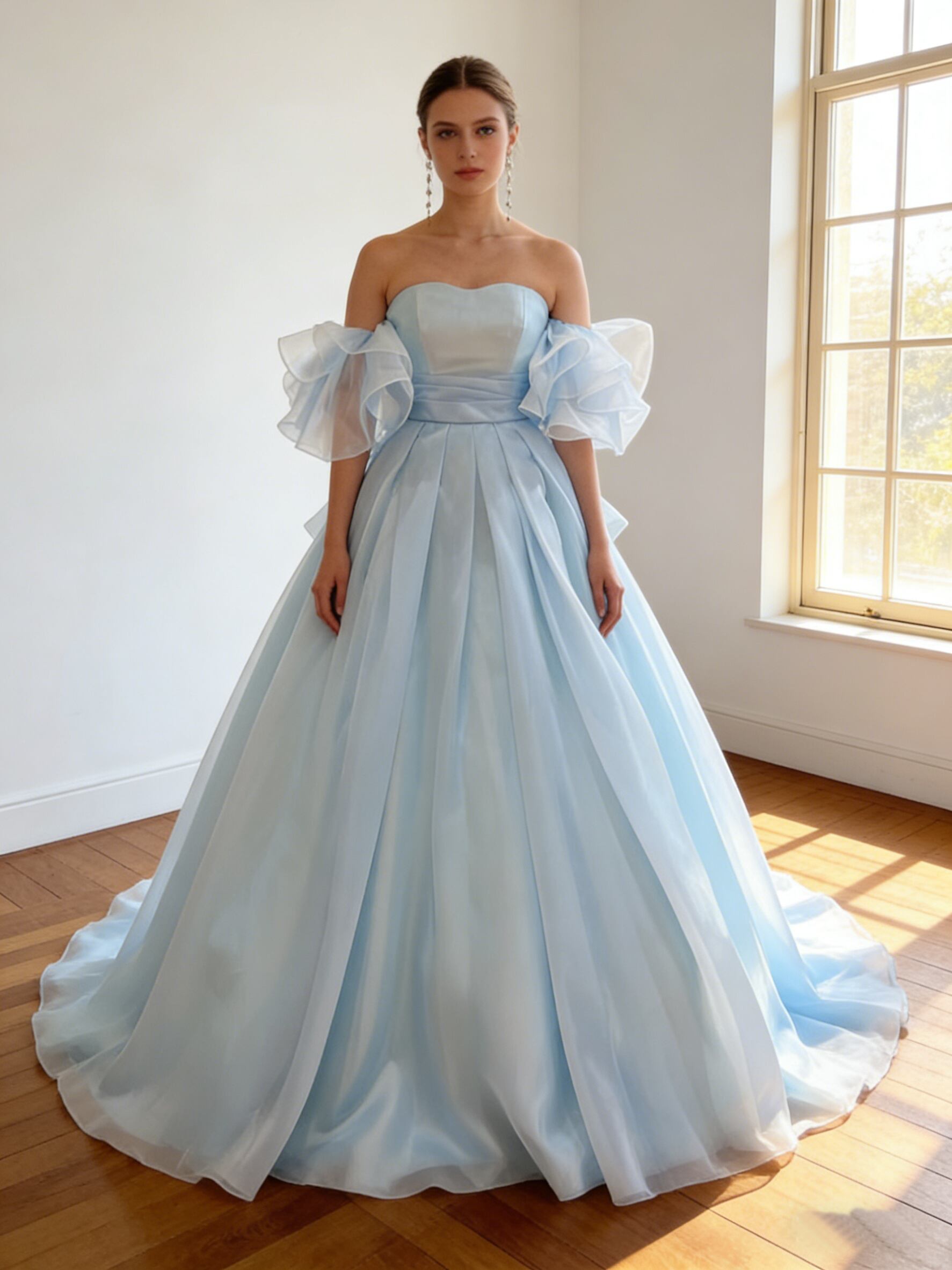 カラードレス 爽やかで優しいブルー シルクオーガンジーサテン 取り外し可能な付け袖 トレーン ブライダル