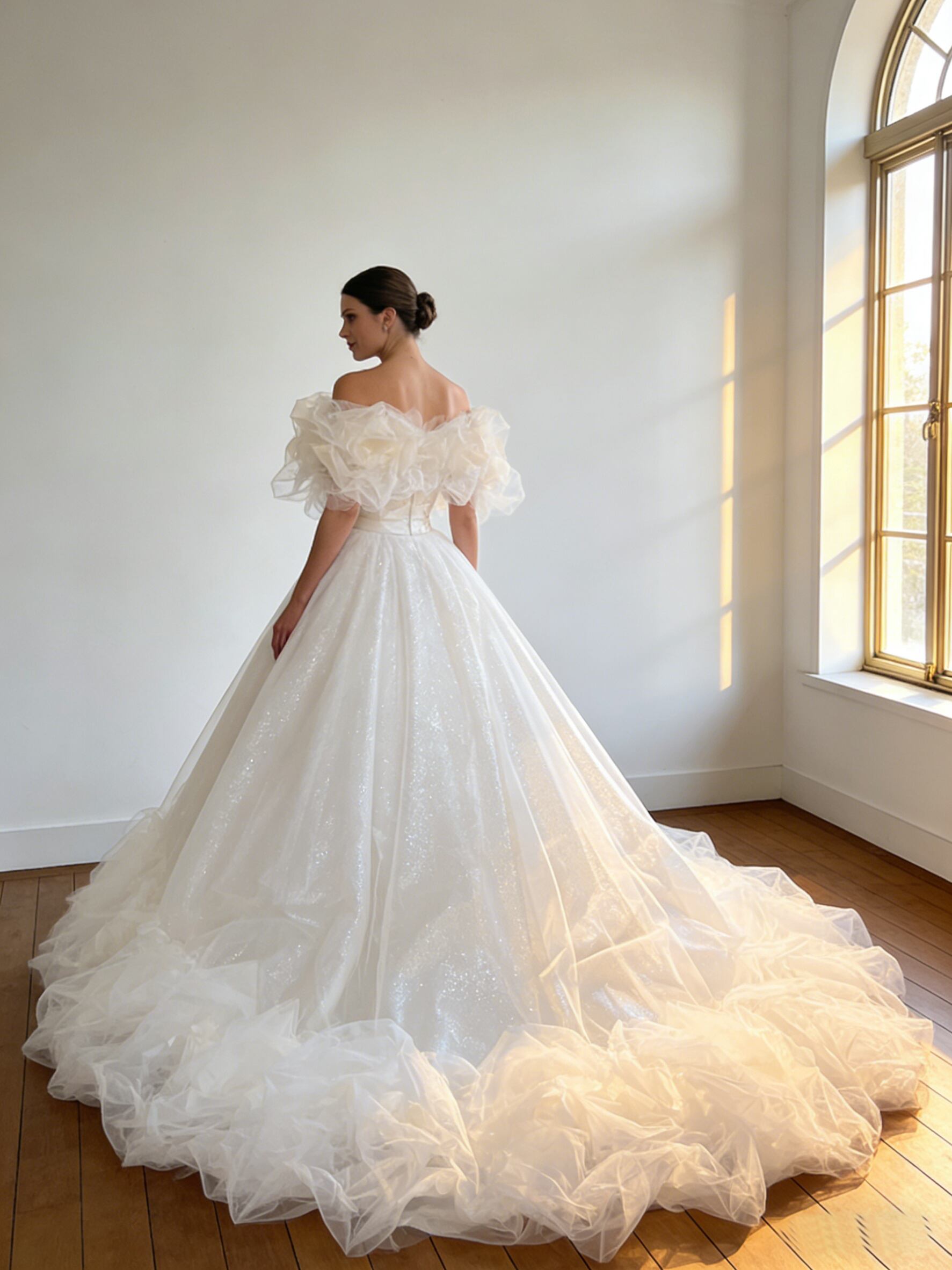 ウエディングドレス オフホワイト オフショルダー フリルトレーン 憧れのドレス ブライダル