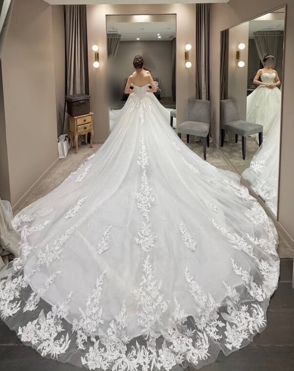 ウエディングドレス オフホワイト ビスチェドレス 贅沢な総レース 華やかなトレーン披露宴/結婚式